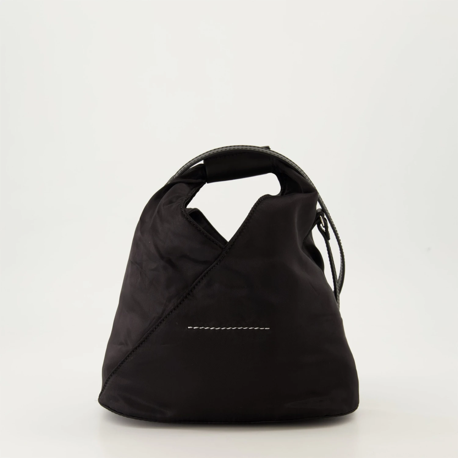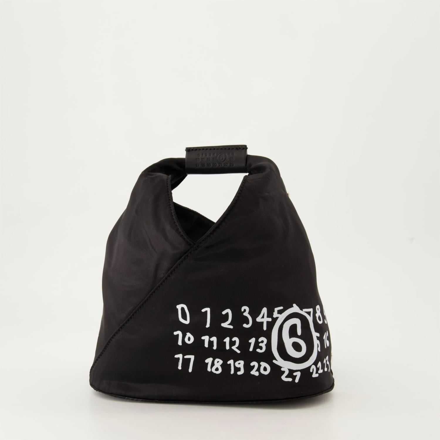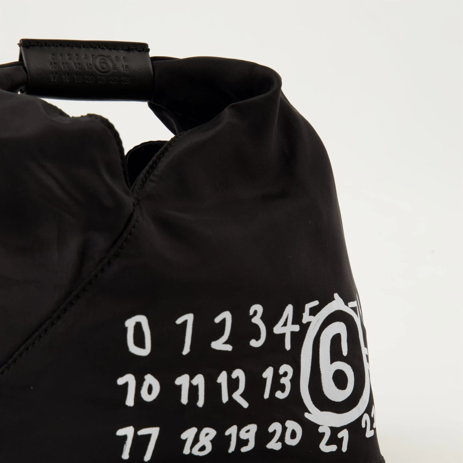 Sac en nylon noir de la marque MM6, conçu pour les femmes. Ce modèle fait partie de la collection Automne-Hiver 2024 et présente des détails en cuir et une signature unique.