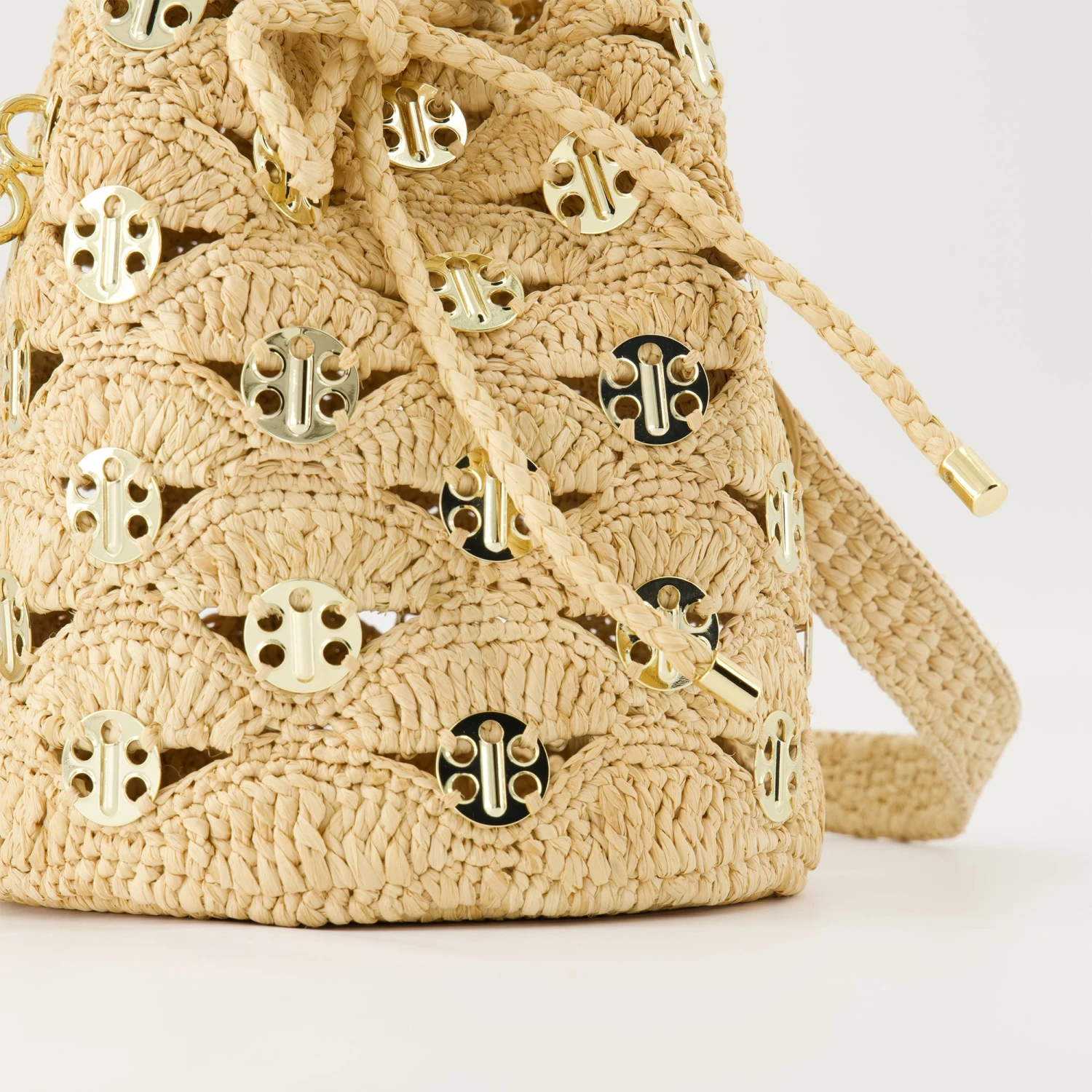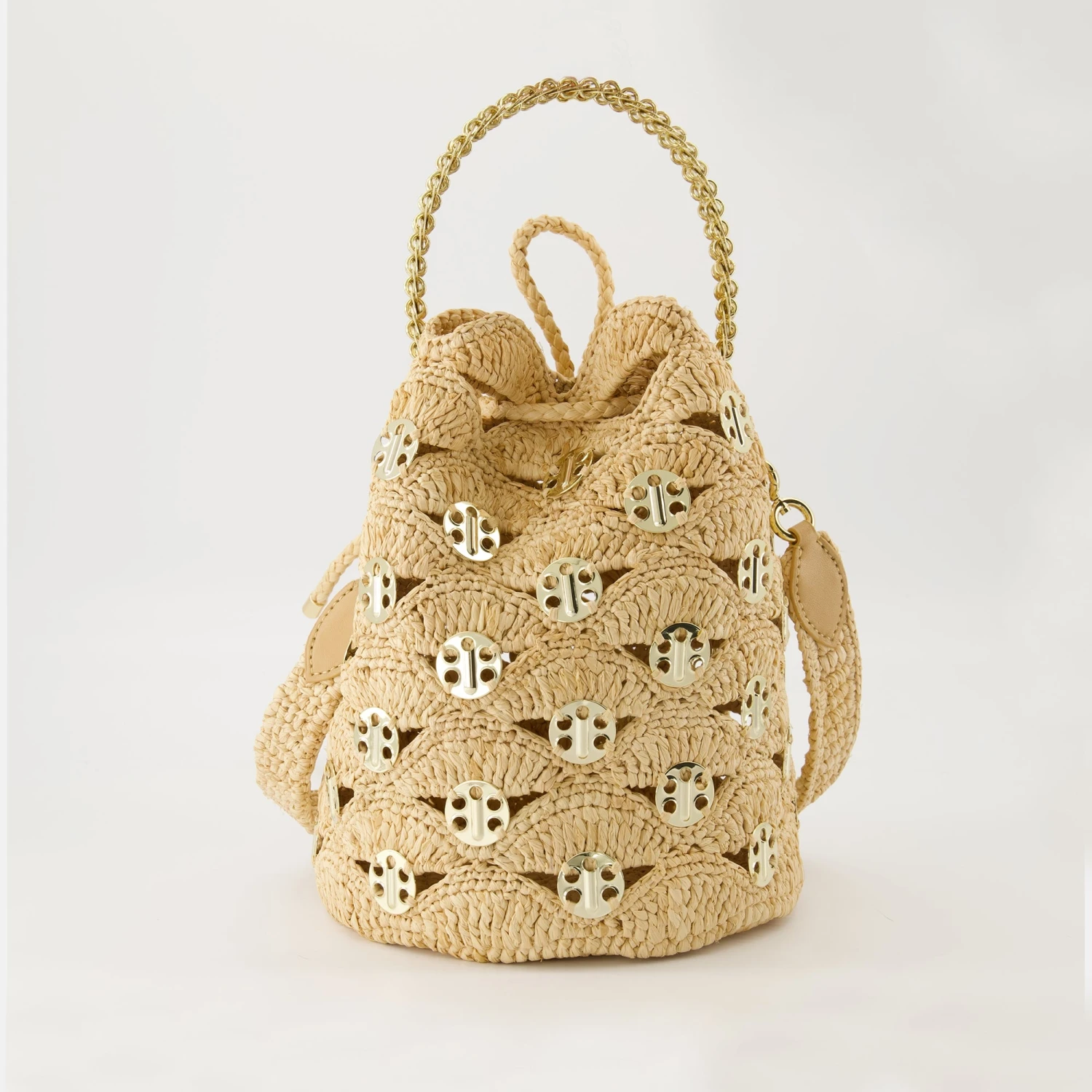 Le sac seau en raphia signature 1969 de Rabanne est un accessoire féminin élégant. Il fait partie de la collection Printemps-Été 2025 et présente des détails raffinés.