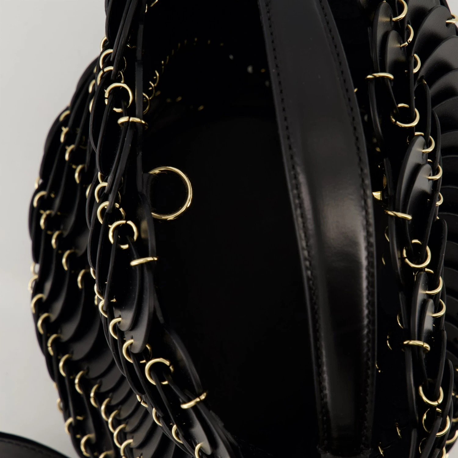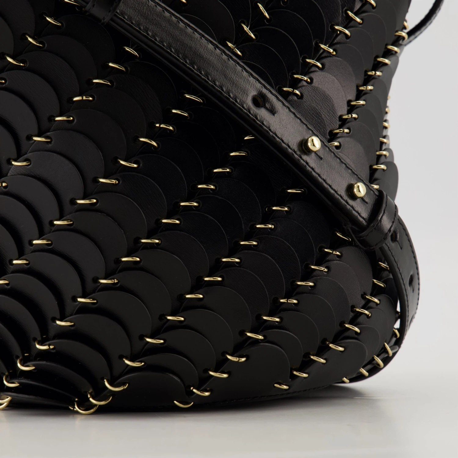 Le sac seau Paco noir de la marque Rabanne est un accessoire féminin élégant. Faisant partie de la collection Printemps-Été 2025, il est réalisé en cuir de veau avec des finitions dorées.
