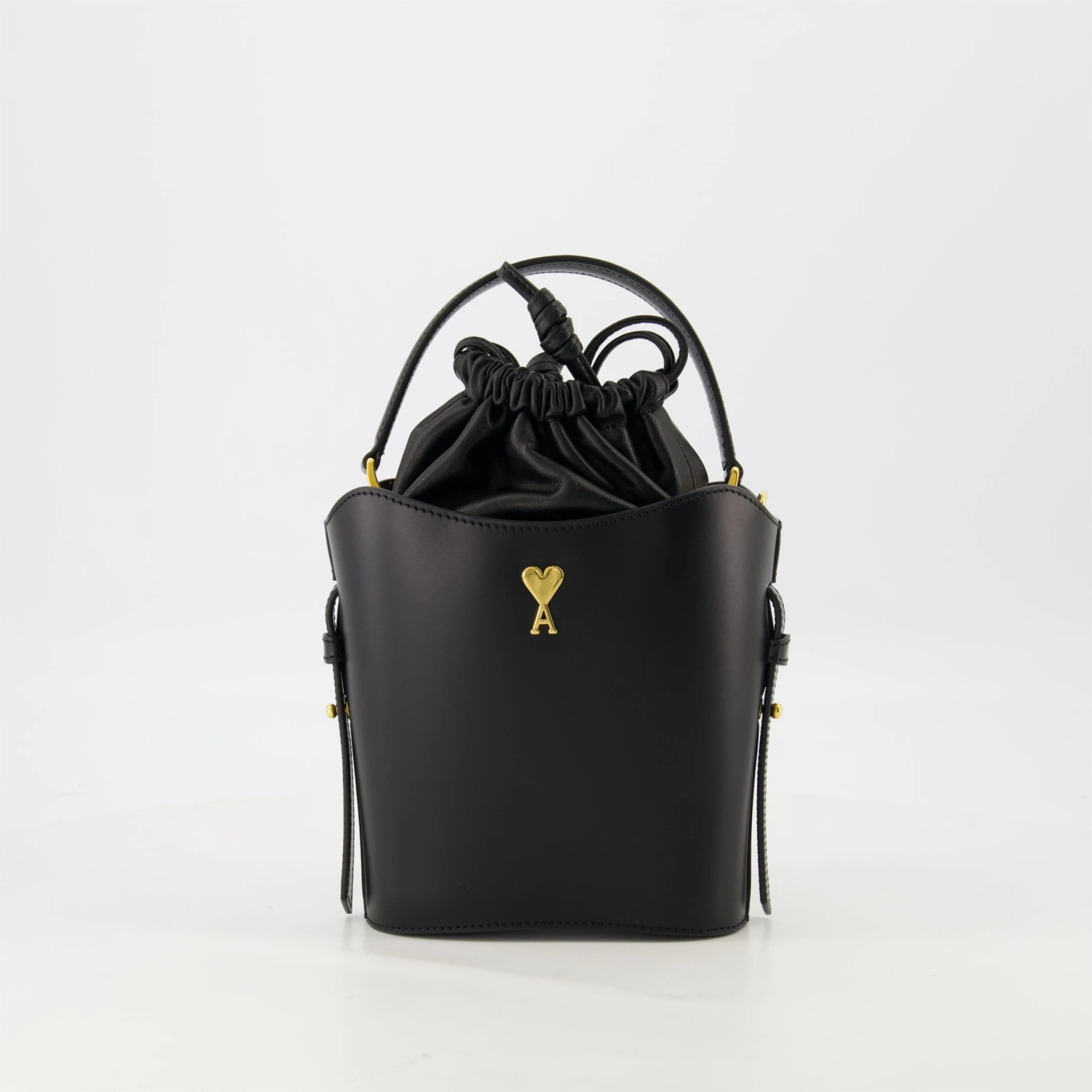 Mini sac seau Paris de la marque AMI Paris est un accessoire féminin en cuir de veau. Ce modèle mixte fait partie de la collection Printemps-Été 2025.