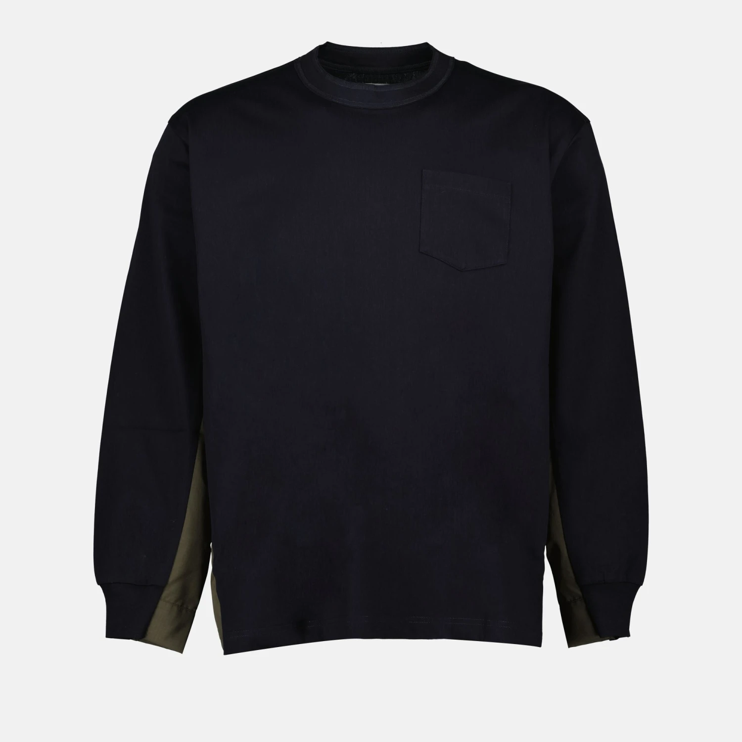 T-shirt bicolore Sacai collection Automne-Hiver 2024 pour Homme. Réalisé en jersey de coton. Article Design bicolore. Col rond et Manches longues.