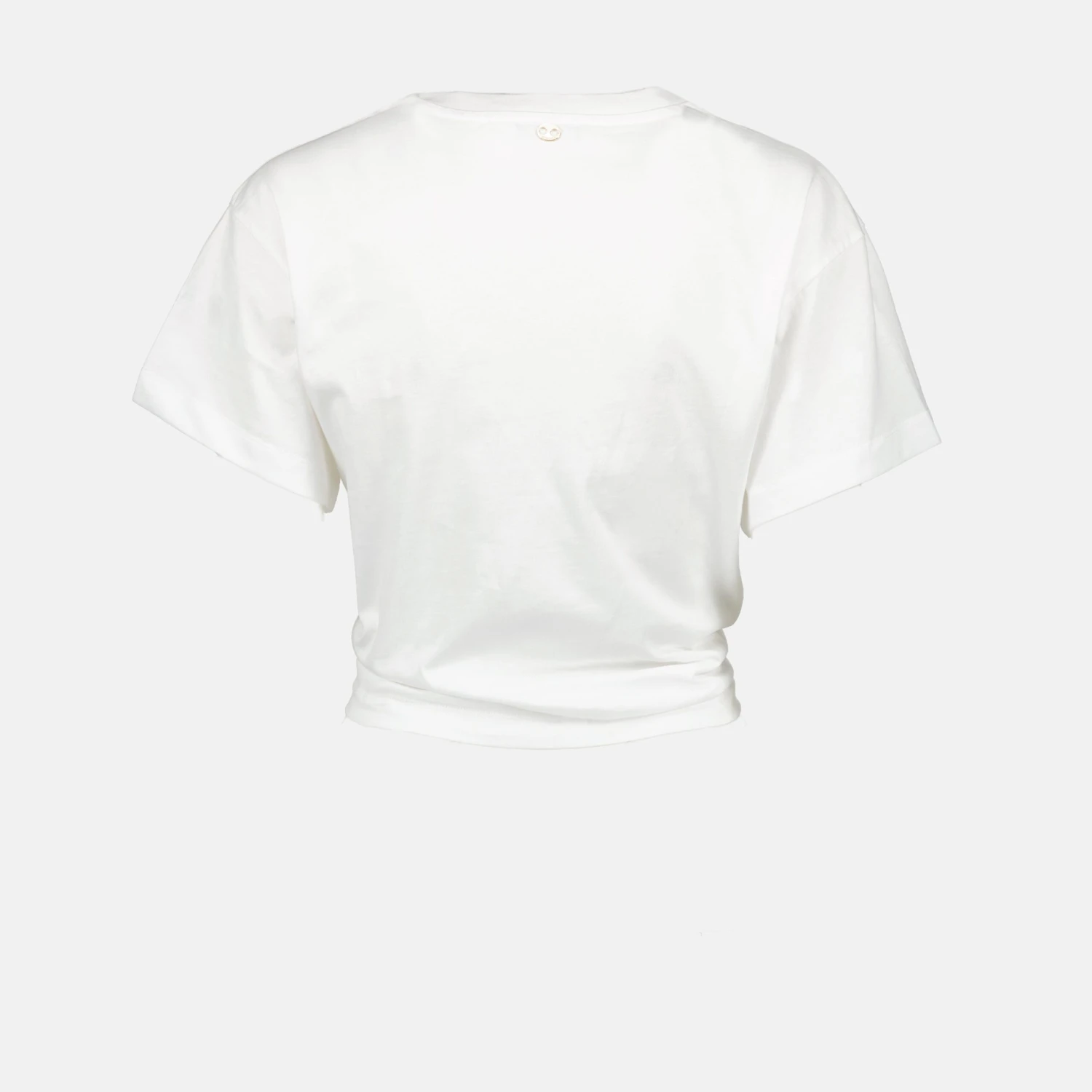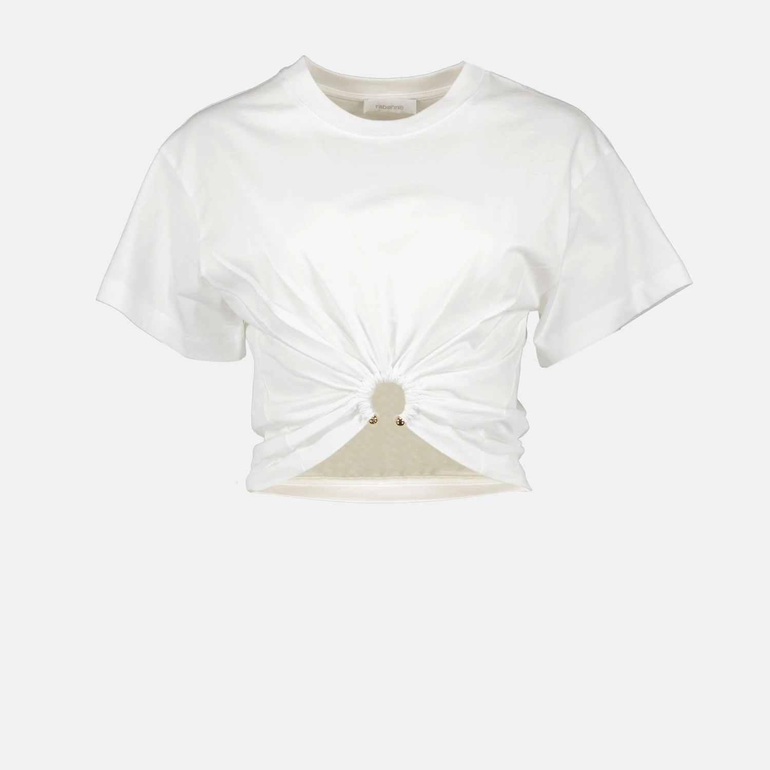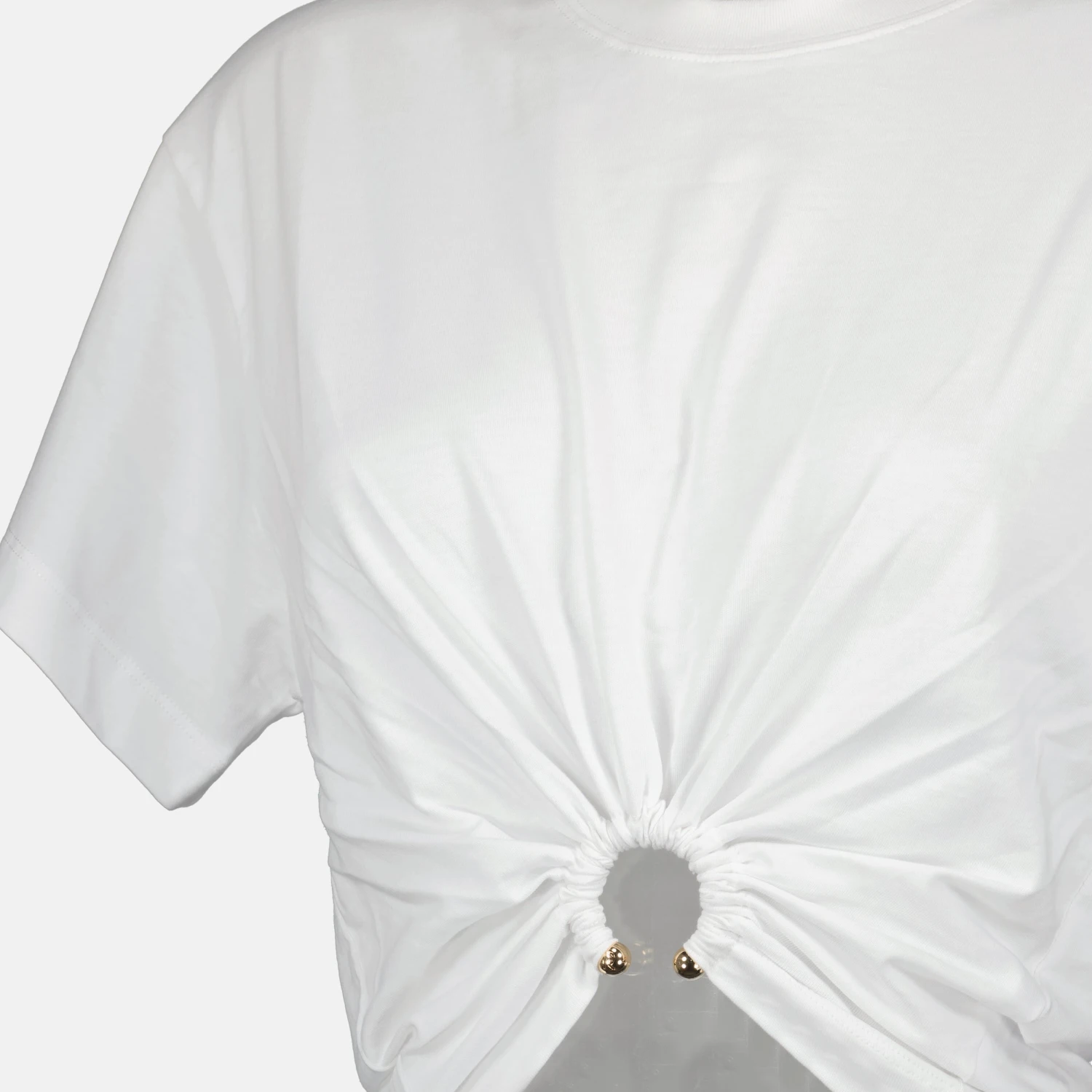 T-shirt crop blanc à anneau de la marque Rabanne pour femme. Cette pièce fait partie de la collection Automne-Hiver 2024 et est réalisée en coton avec des détails raffinés.