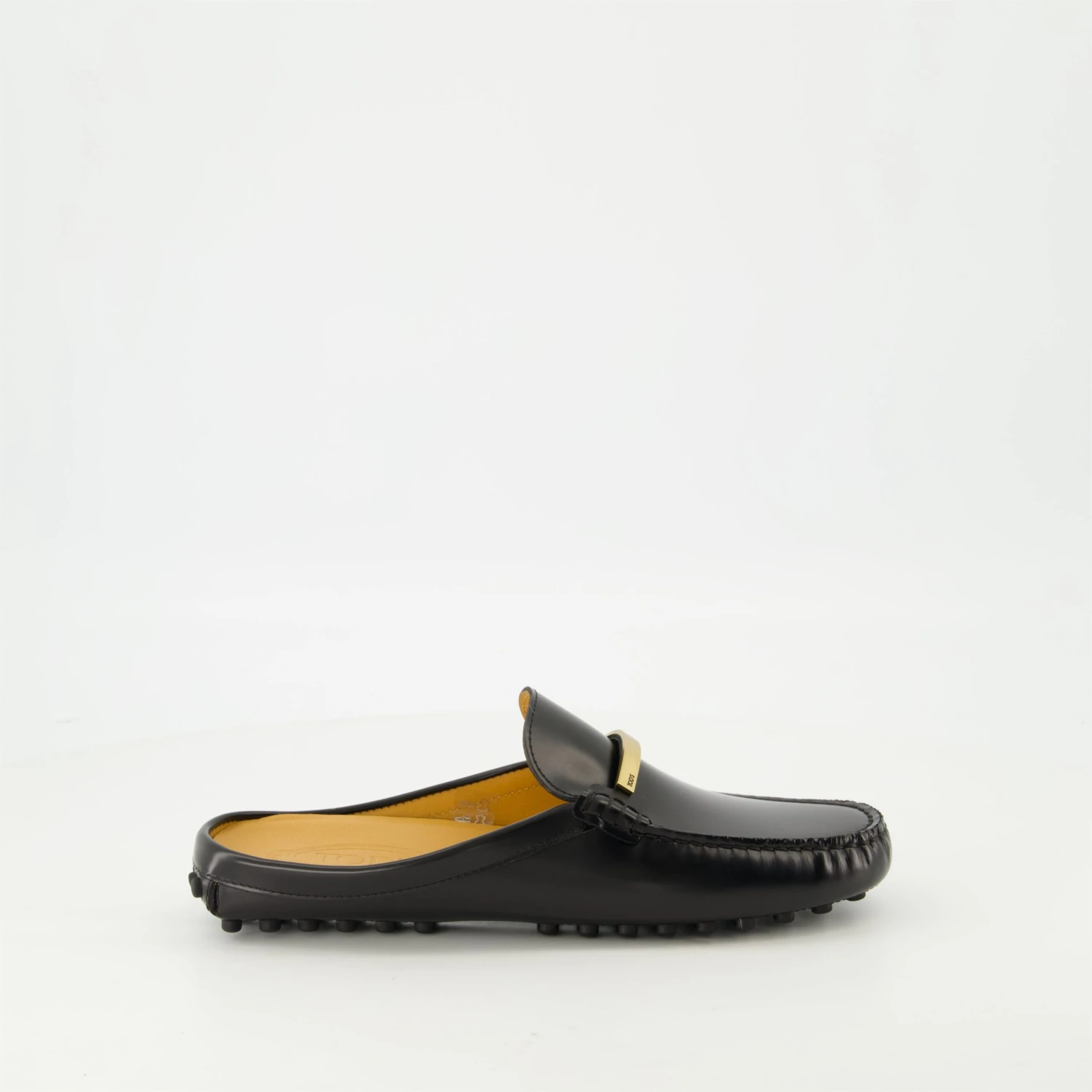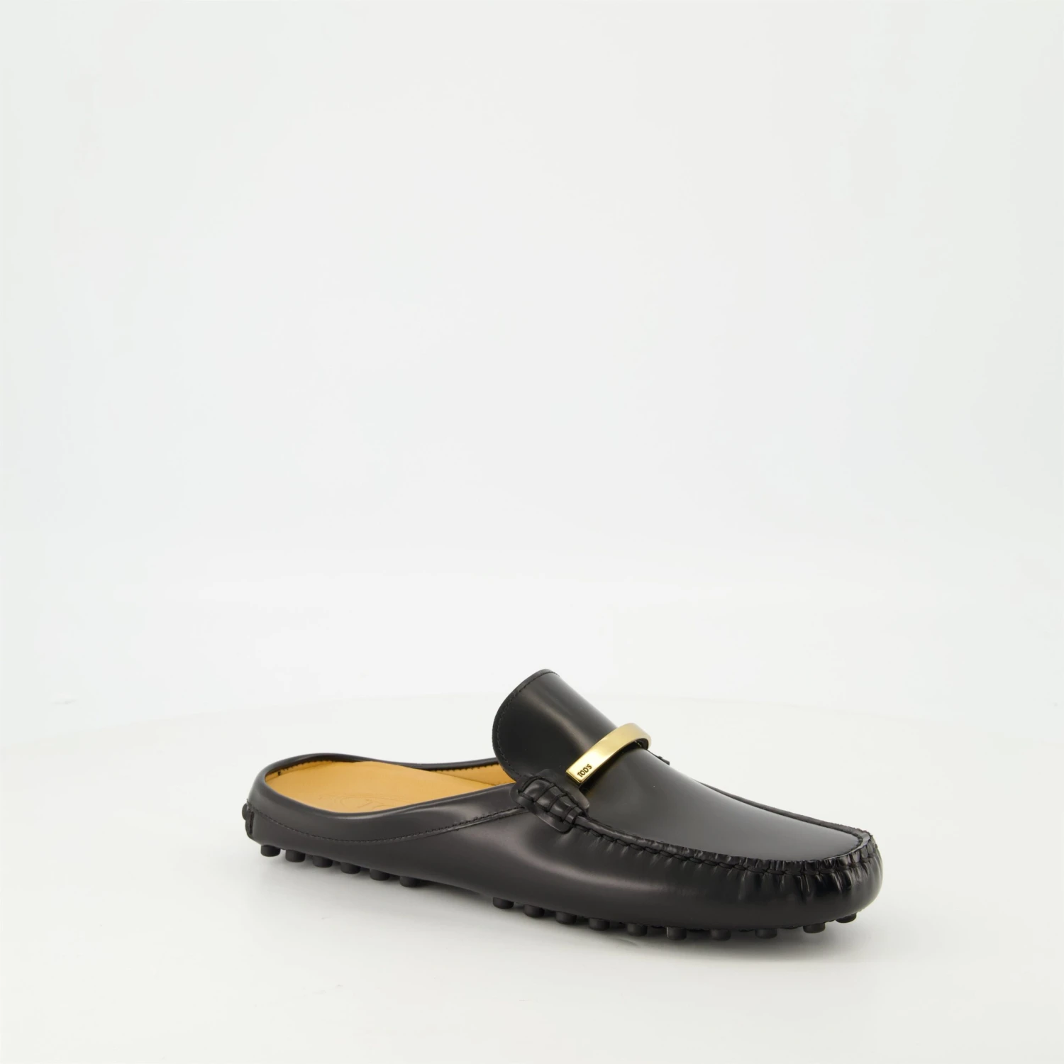 Mules mocassins Gommino en cuir noir de Tod’s pour femme, collection Printemps-Été 2025. Elles présentent une semelle crantée en gomme et un design élégant avec des coutures apparentes.