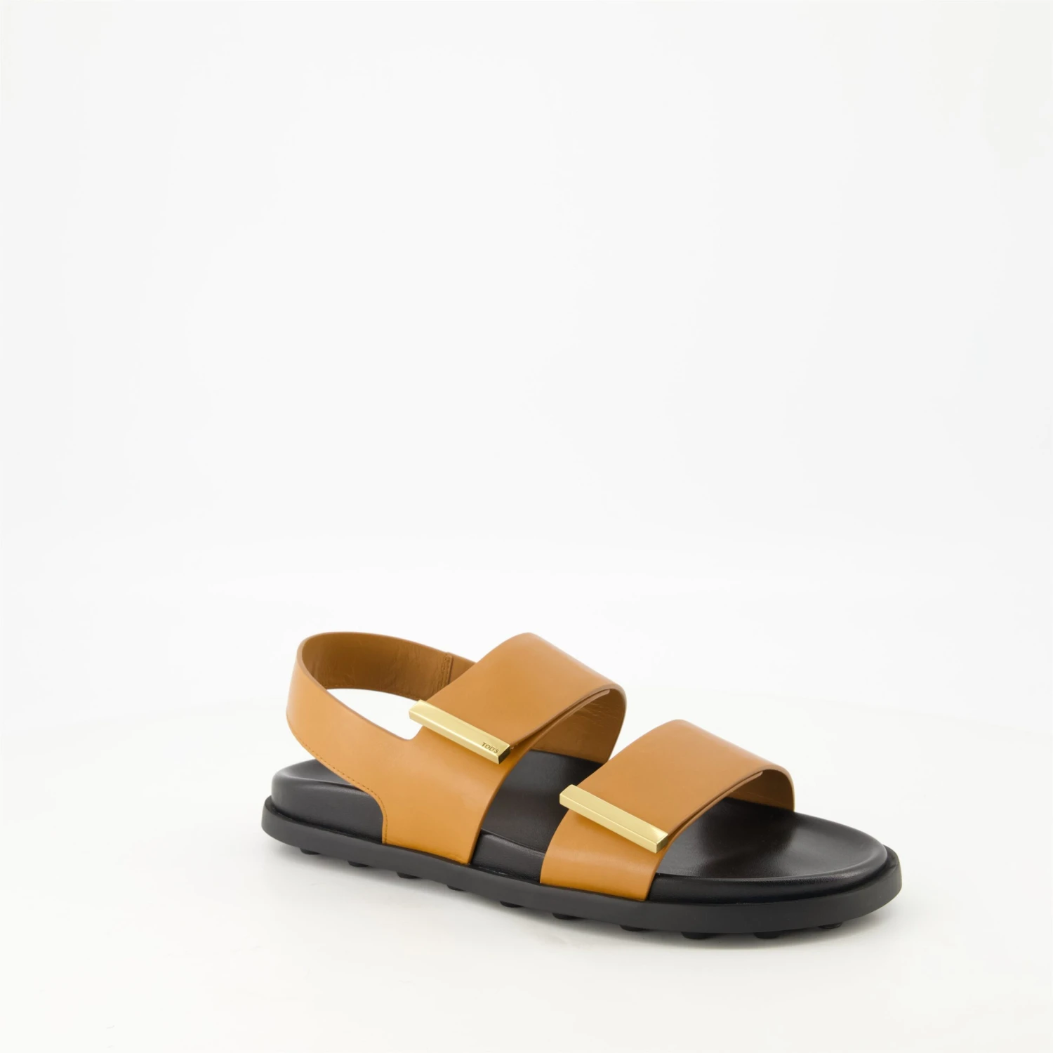 Sandales à double brides marron de la marque Tod’s pour femme, réalisées en cuir lisse et caoutchouc. Cette paire fait partie de la collection Printemps-Été 2025 et présente des détails en métal griffé.