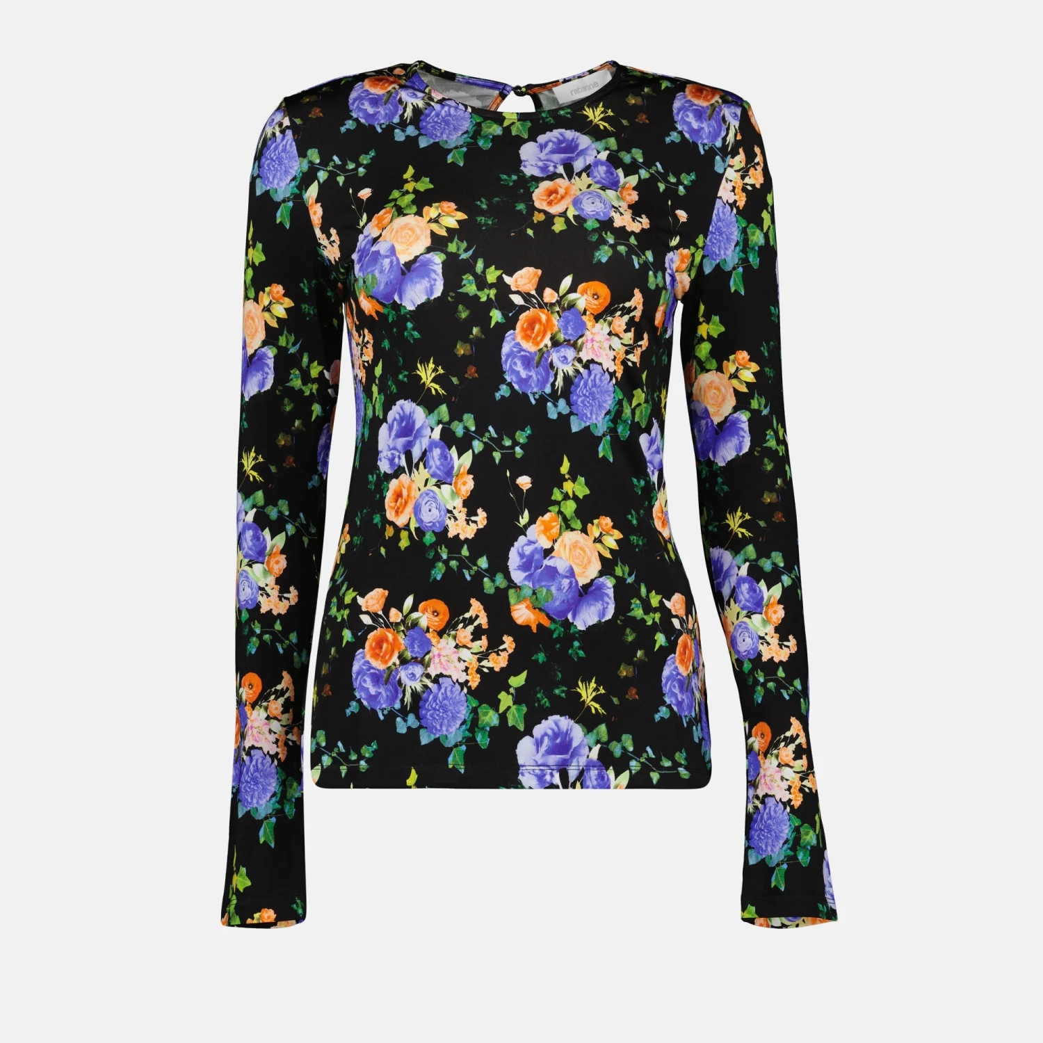 Top à imprimé fleur de la marque Rabanne, conçu pour femme. Il fait partie de la collection Automne-Hiver 2024 et est réalisé en viscose avec un col rond et des manches longues.