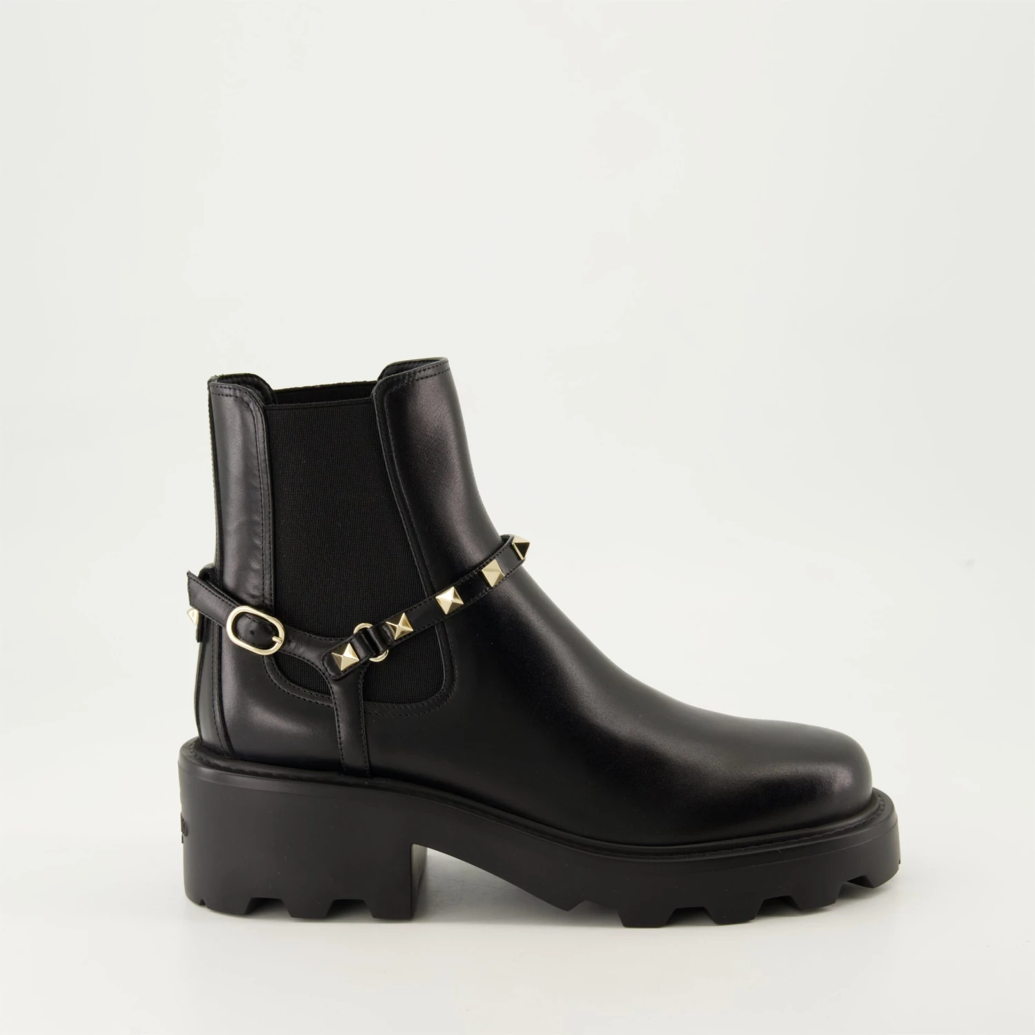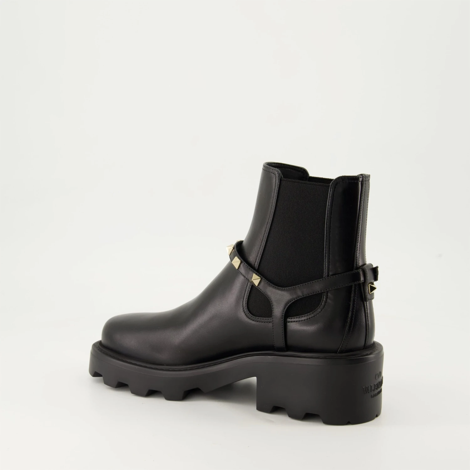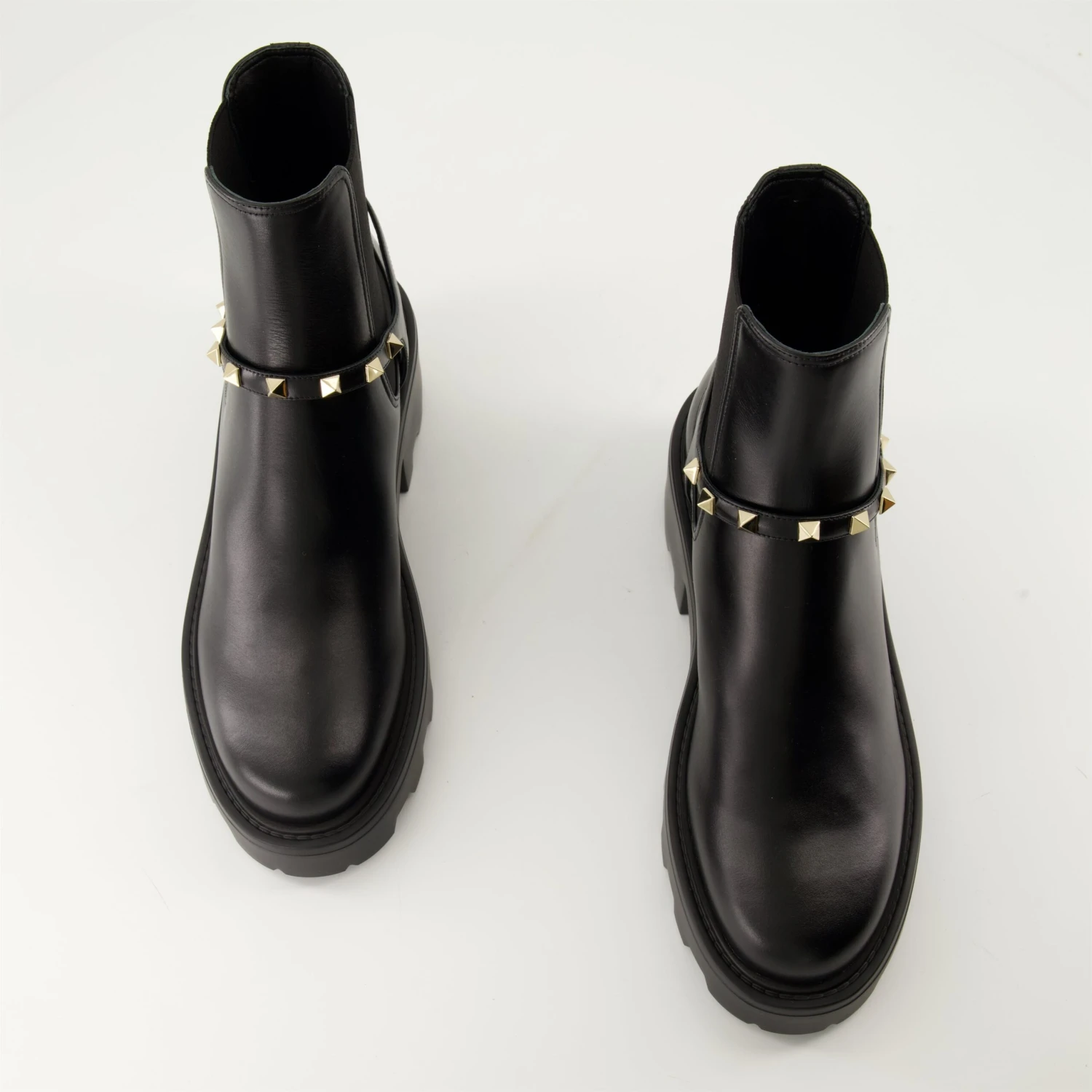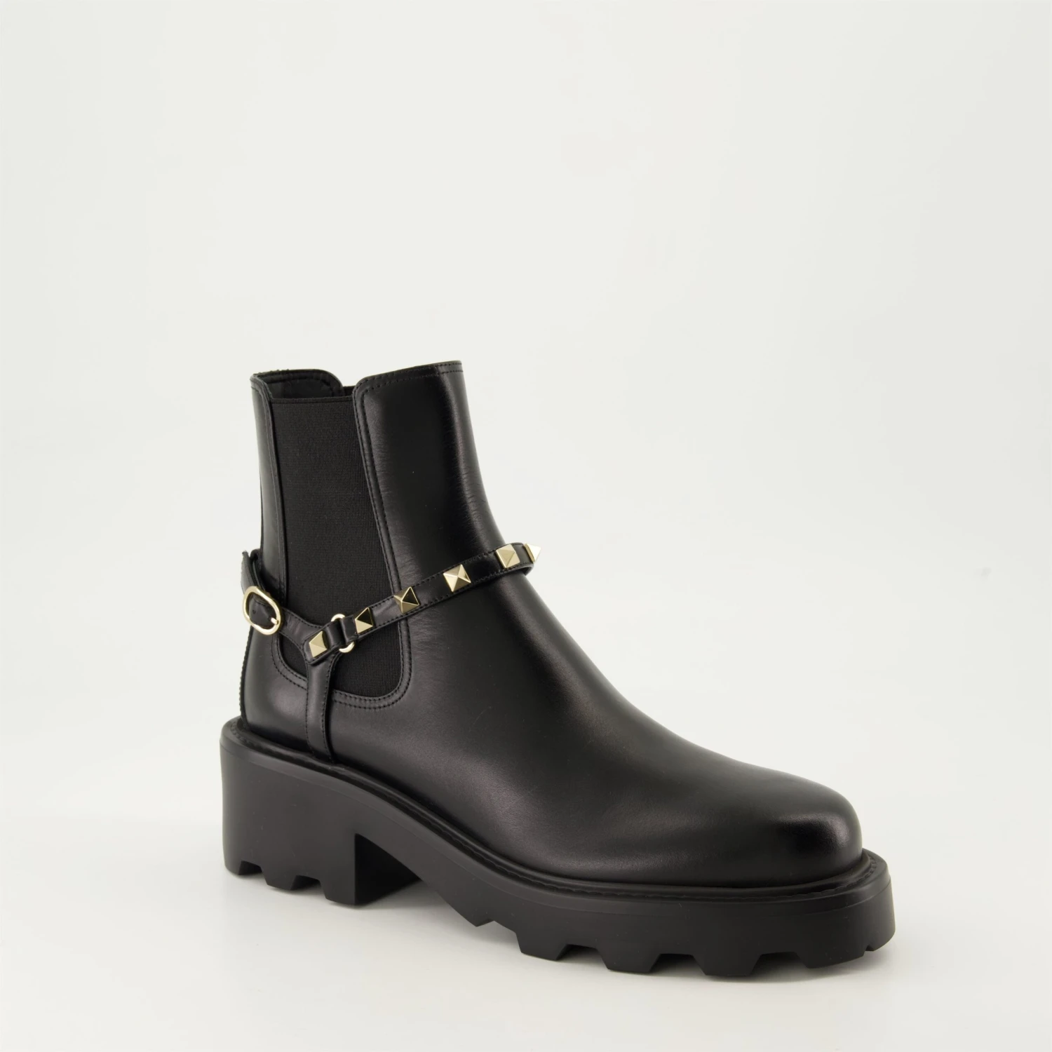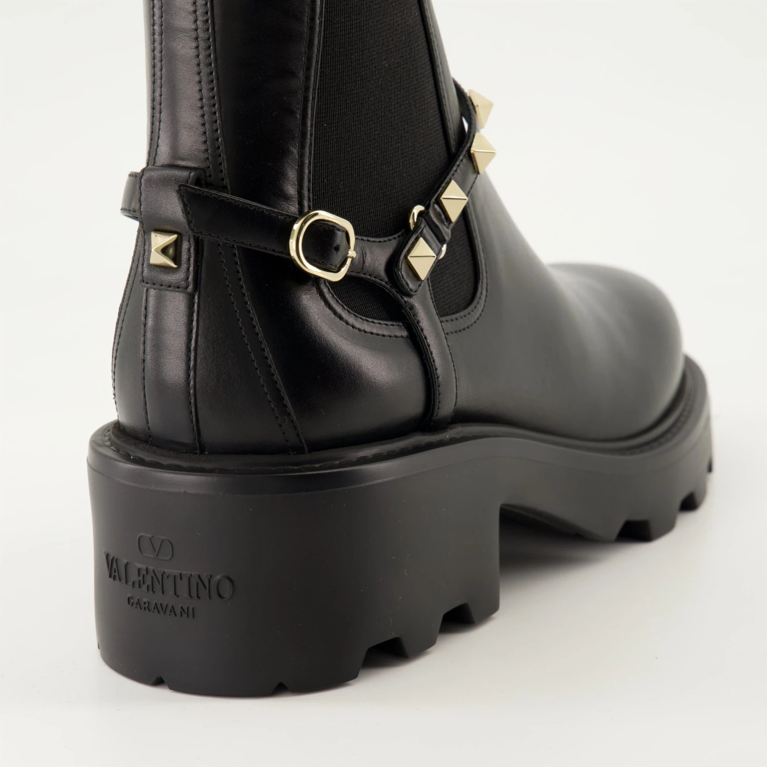 Bottines Rockstud en cuir lisse de Valentino Garavani pour femme, alliant élégance et confort. Cette paire fait partie de la collection Automne-Hiver 2024, avec des détails raffinés et modernes.