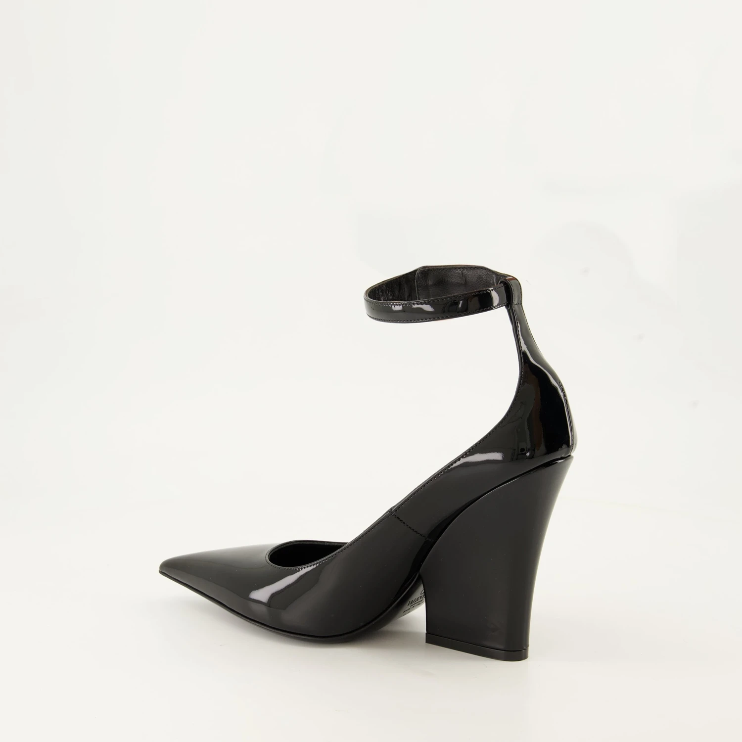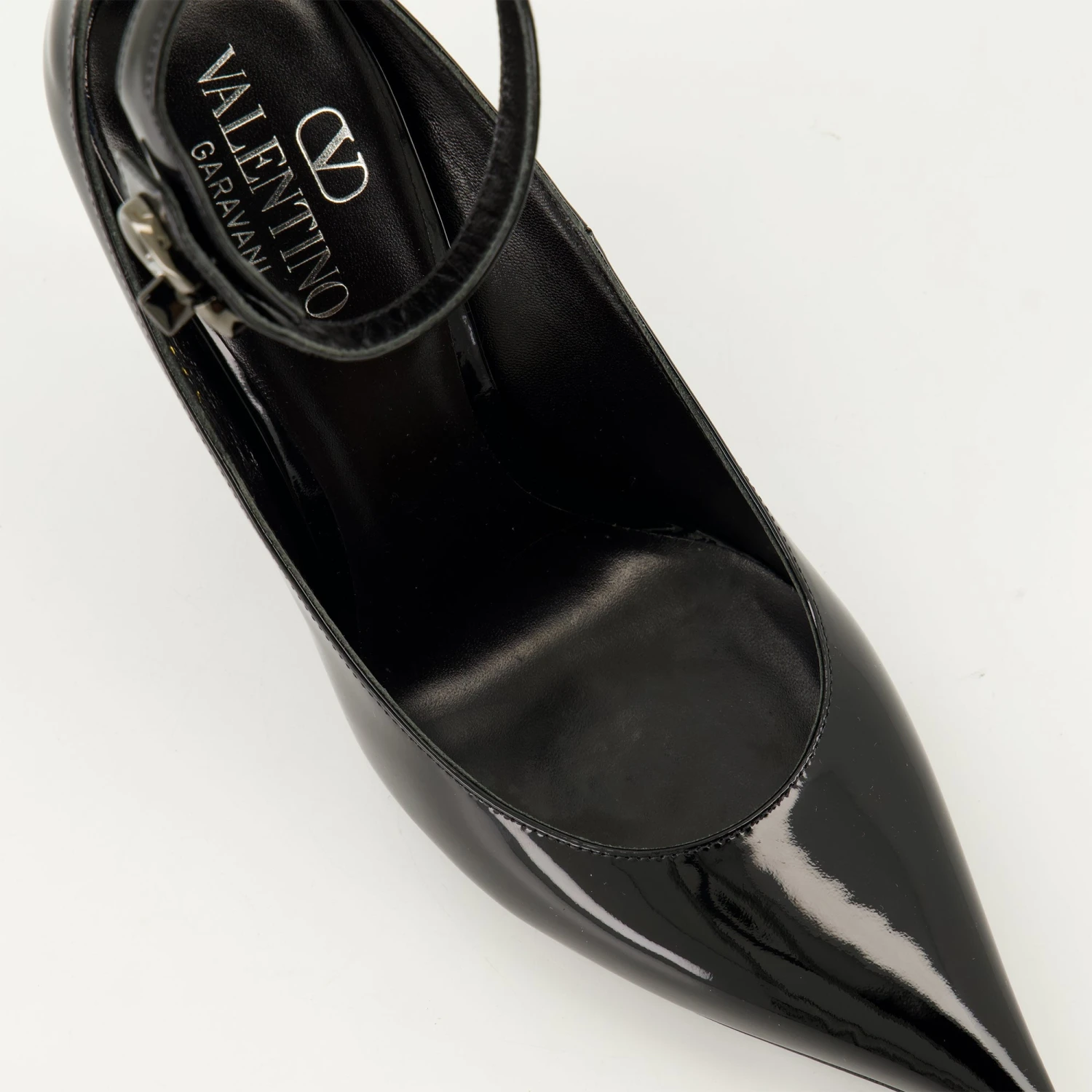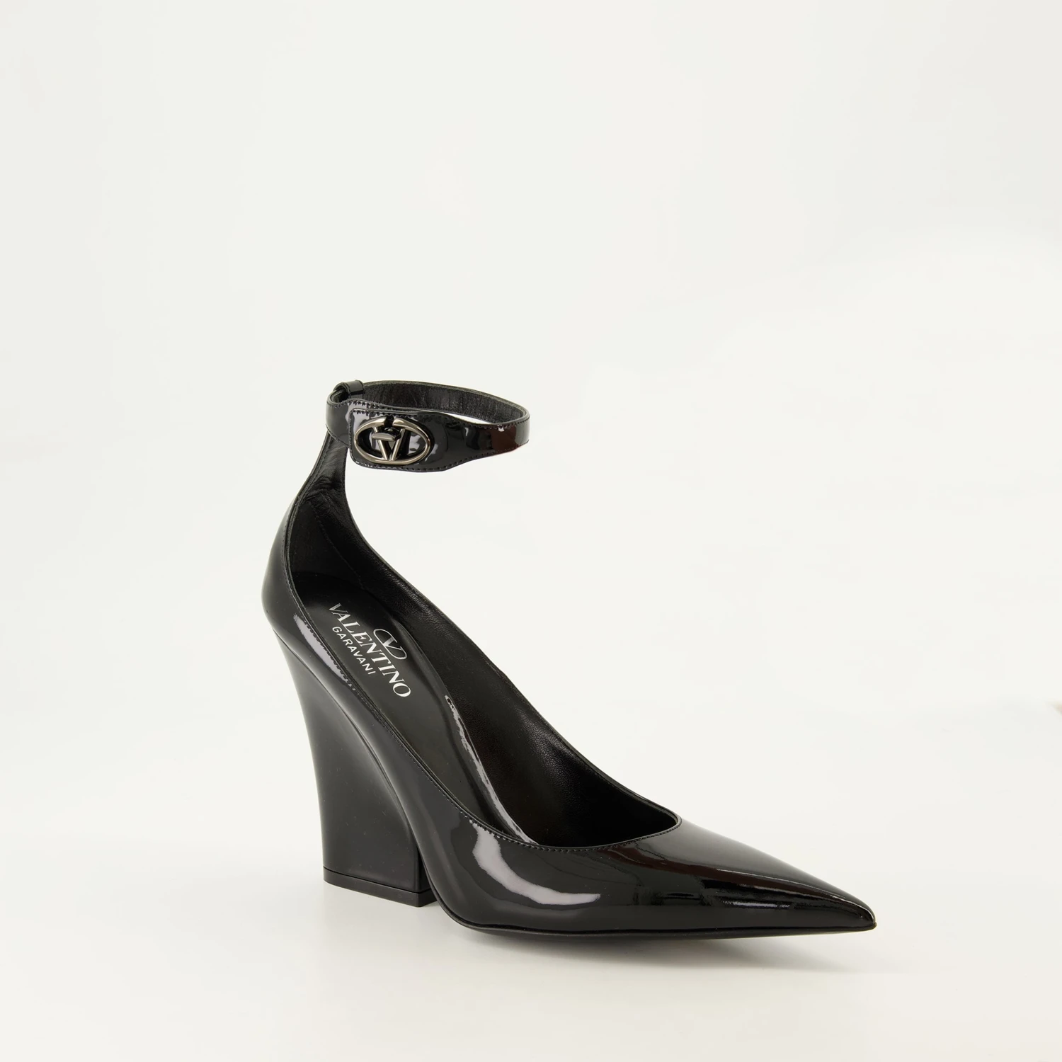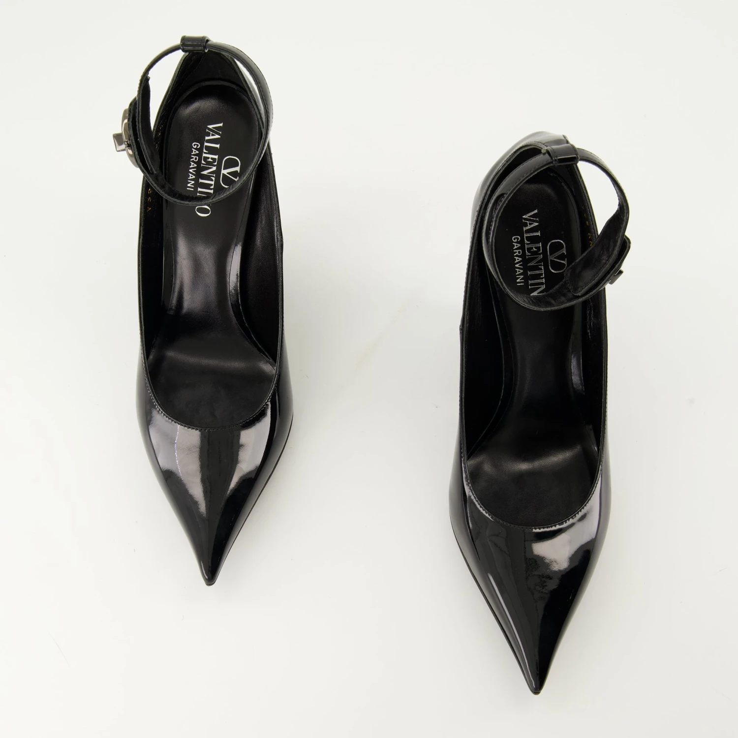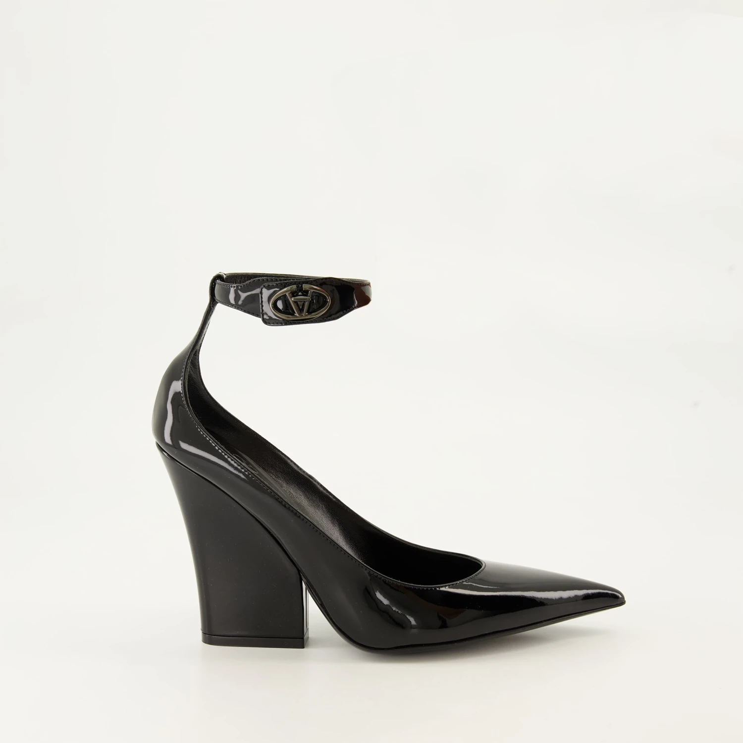 Escarpins VLogo The Bold en cuir brillant noir de Valentino Garavani, conçus pour les femmes. Ils font partie de la collection Automne-Hiver 2024 et présentent un talon épais et une bride ajustable.
