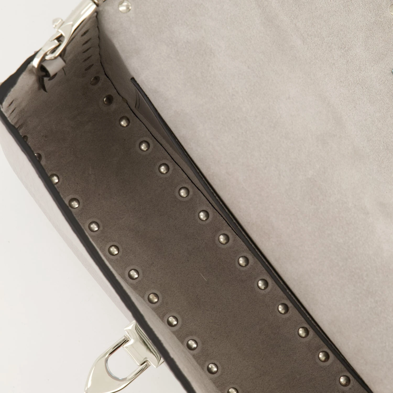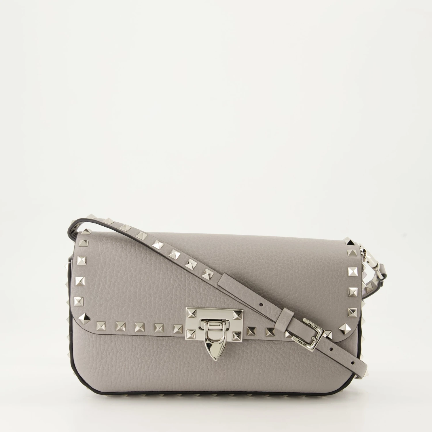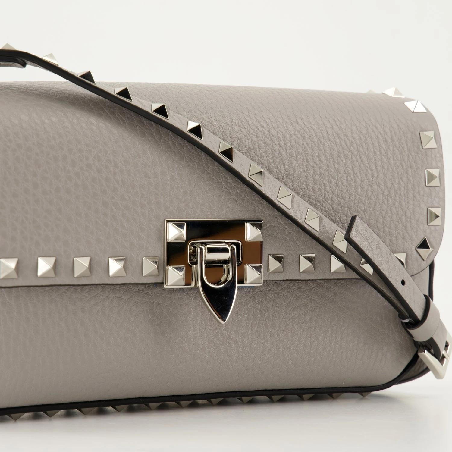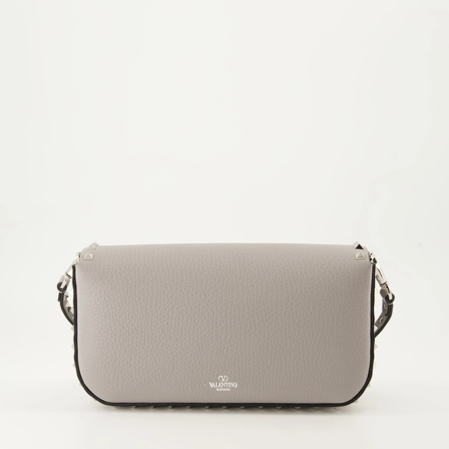 Sac bandoulière Rockstud Valentino Garavani collection Automne-Hiver 2024 pour Femme. Réalisé en cuir grainé. Article Couleur gris. Bandoulière ajustable et amovible.