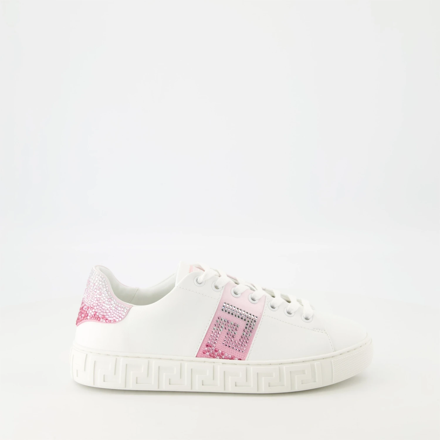 Baskets Greca à cristaux roses de Versace pour femme, alliant style et confort. Cette paire fait partie de la collection Printemps-Été 2025, avec des détails en nylon et cristaux.
