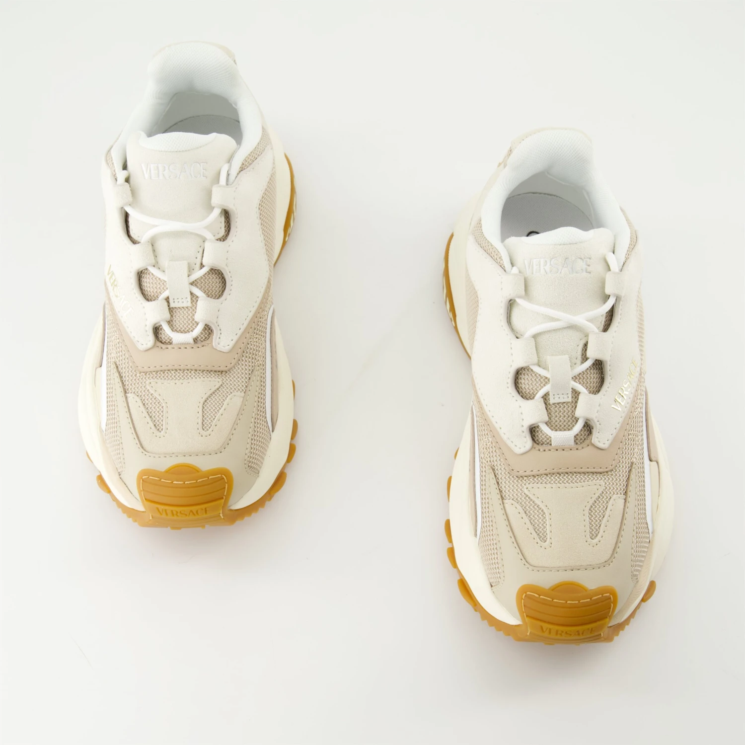 Baskets Mercury M_VS_04 de Versace en cuir et tissu technique beige pour femme. Cette paire fait partie de la collection Printemps-Été 2025.