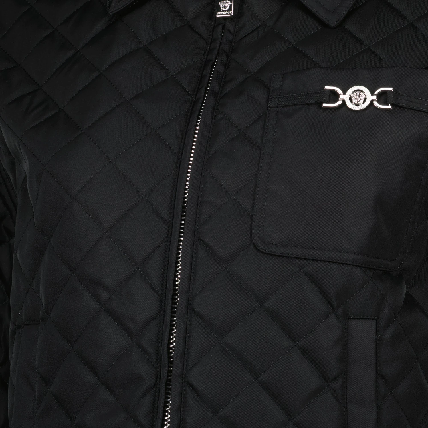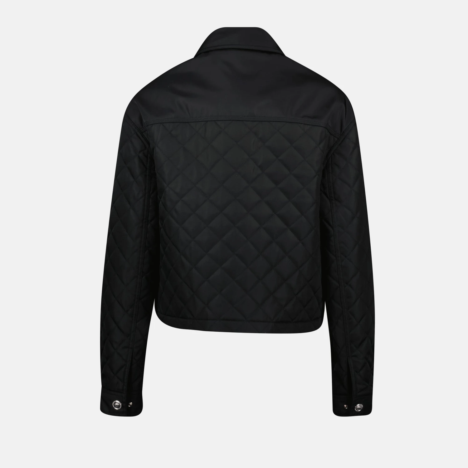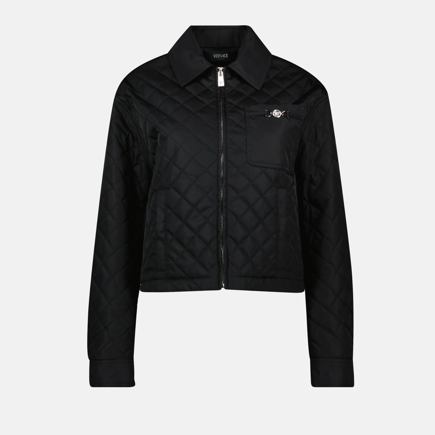 Blouson en losanges matelassés noir de Versace pour femme, alliant élégance et confort. Cette pièce fait partie de la collection Printemps-Été 2025, parfaite pour un style contemporain.