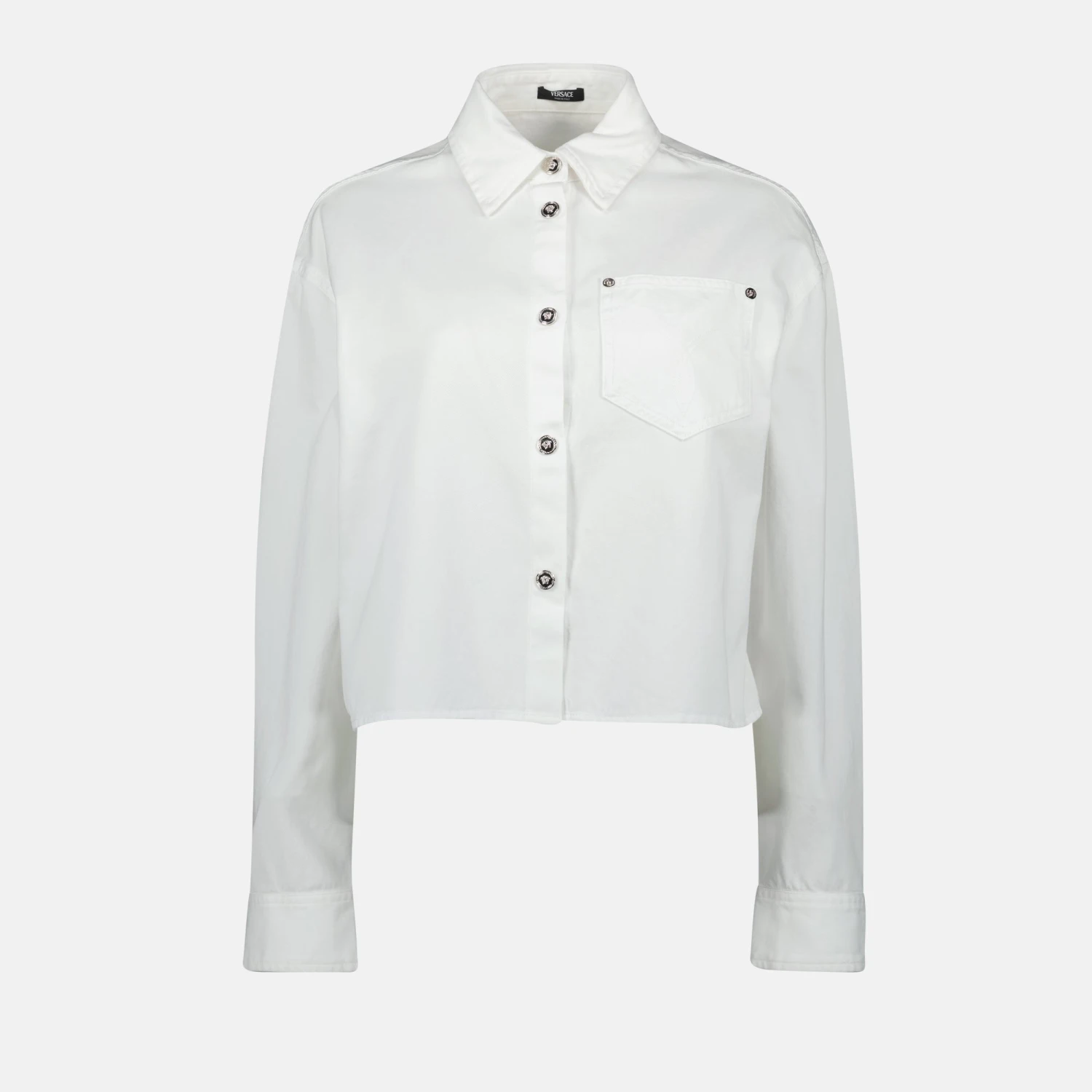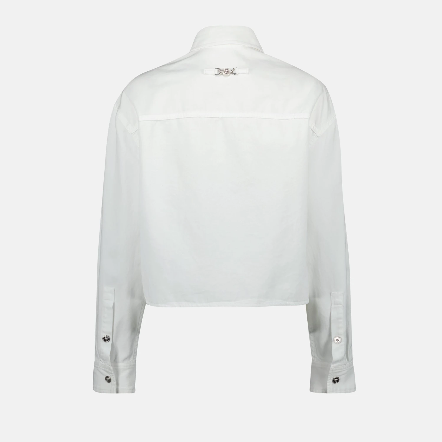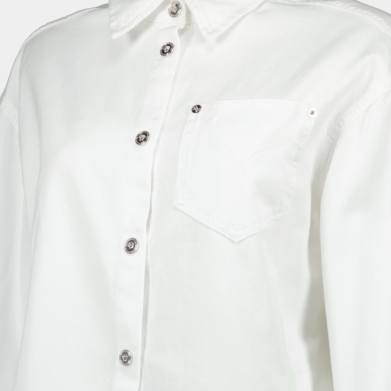 Chemise en denim blanche de Versace pour femme, issue de la collection Printemps-Été 2025. Elle présente un col classique, des manches bouffantes et un logo Medusa ’95 en finition métallique.