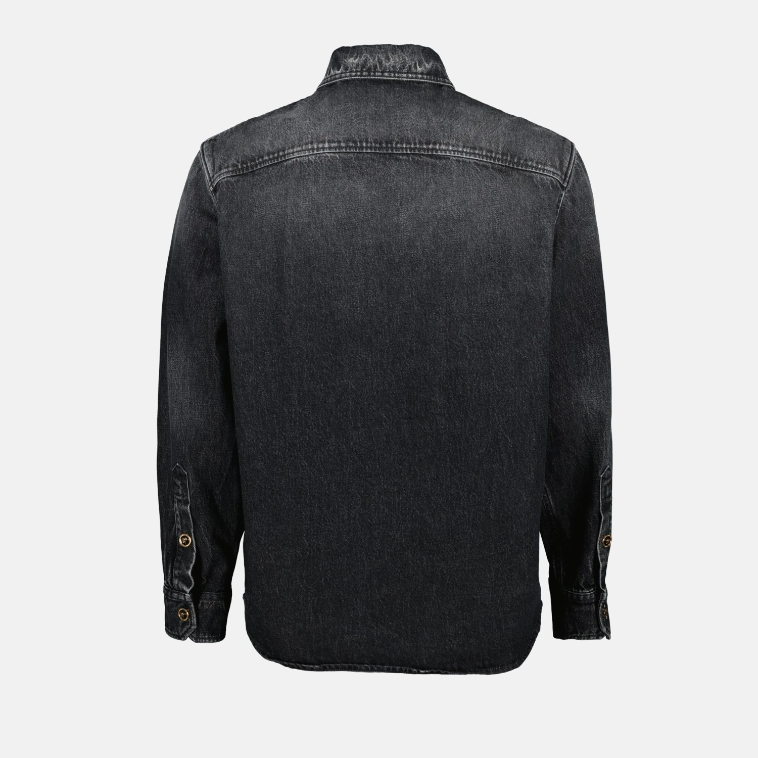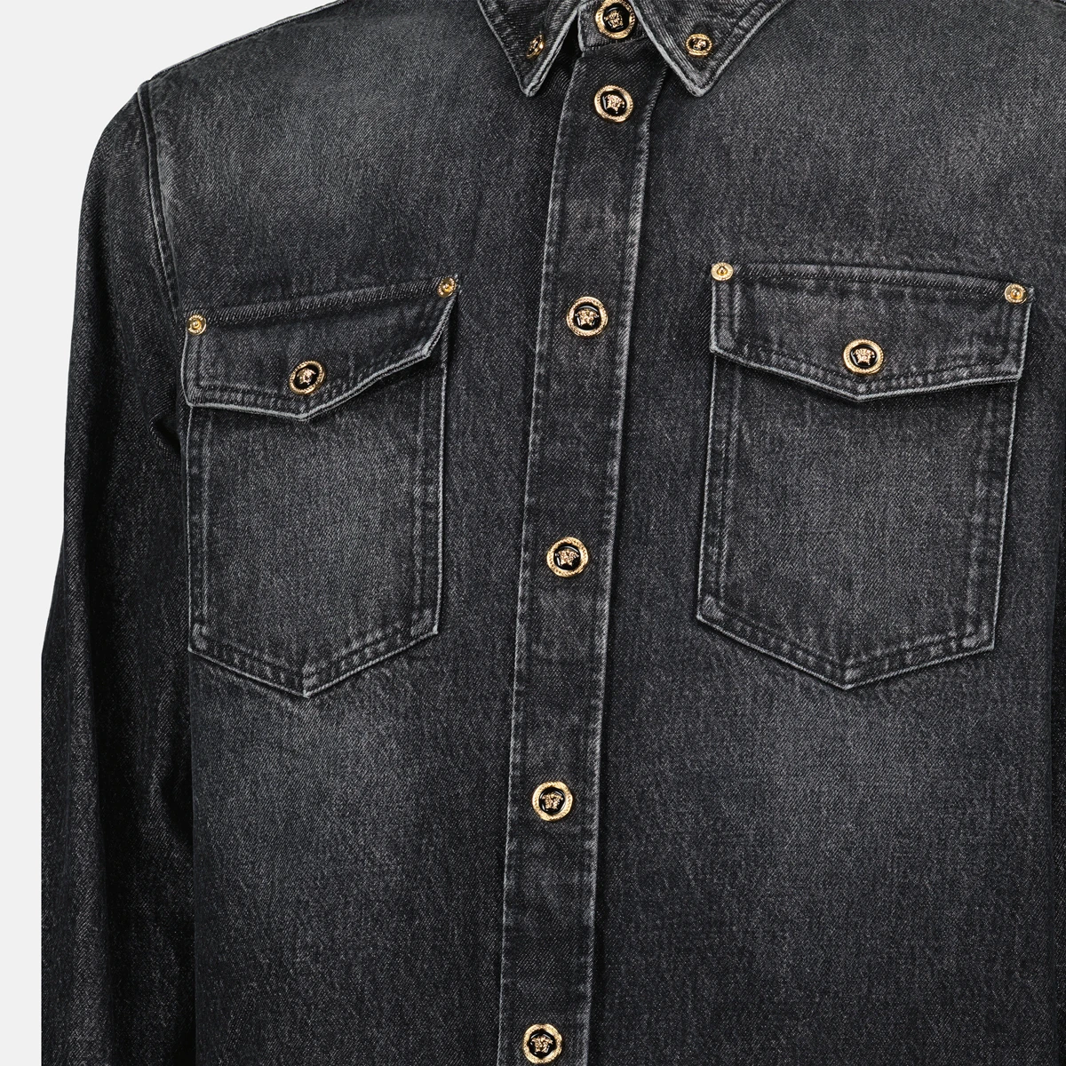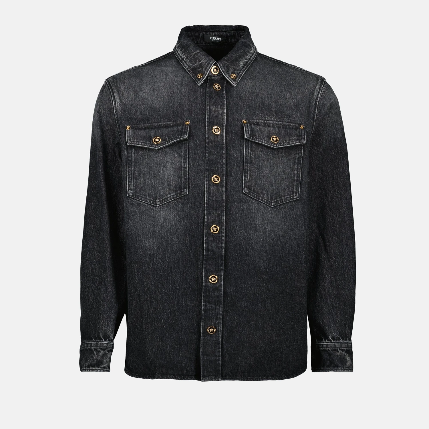 Chemise en denim gris délavé de Versace pour homme, issue de la collection Printemps-Été 2025. Elle présente un col classique, des manches longues et des boutons Medusa en métal.