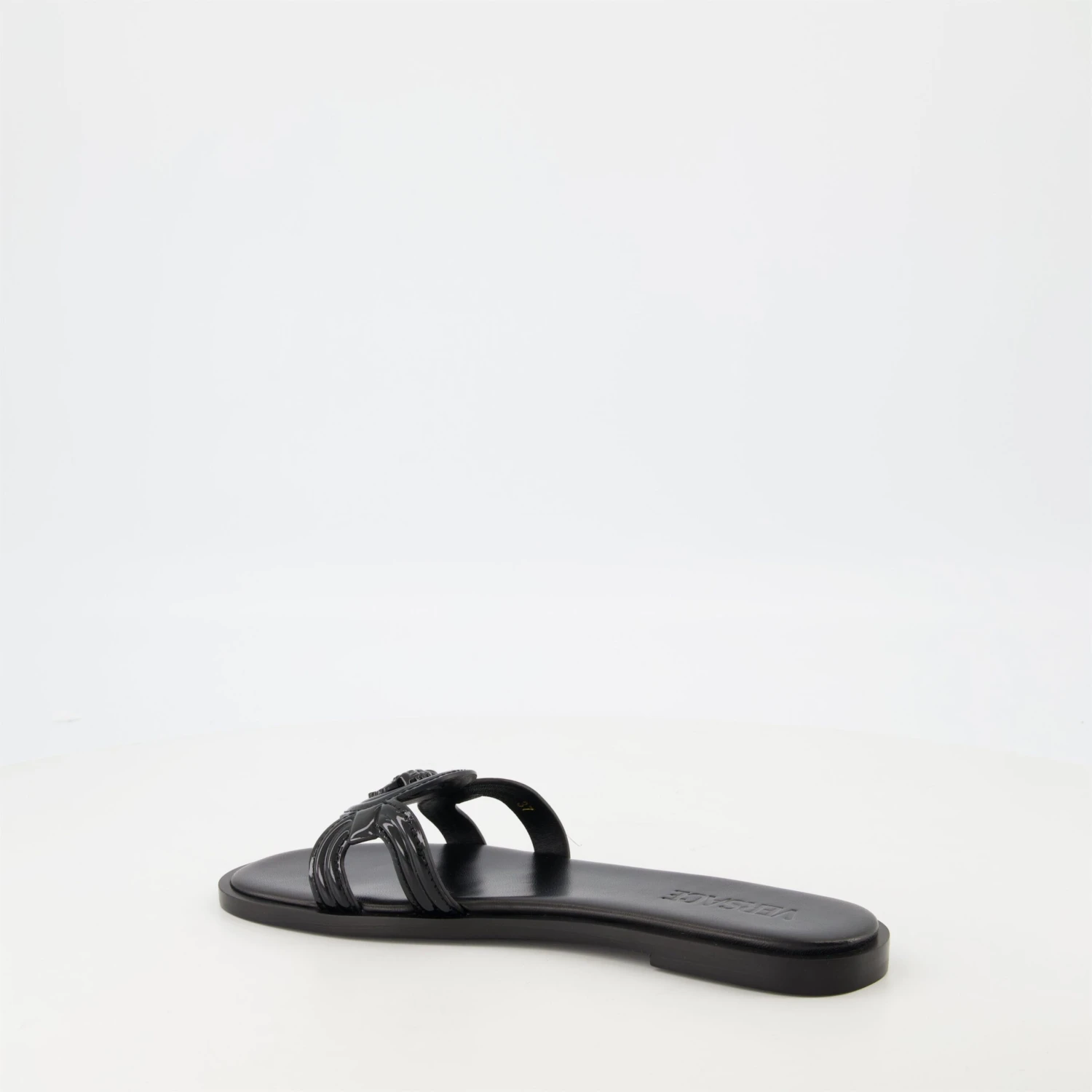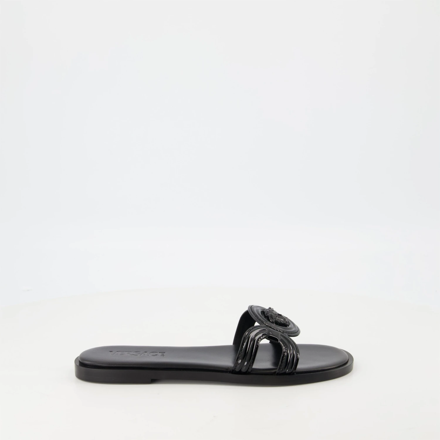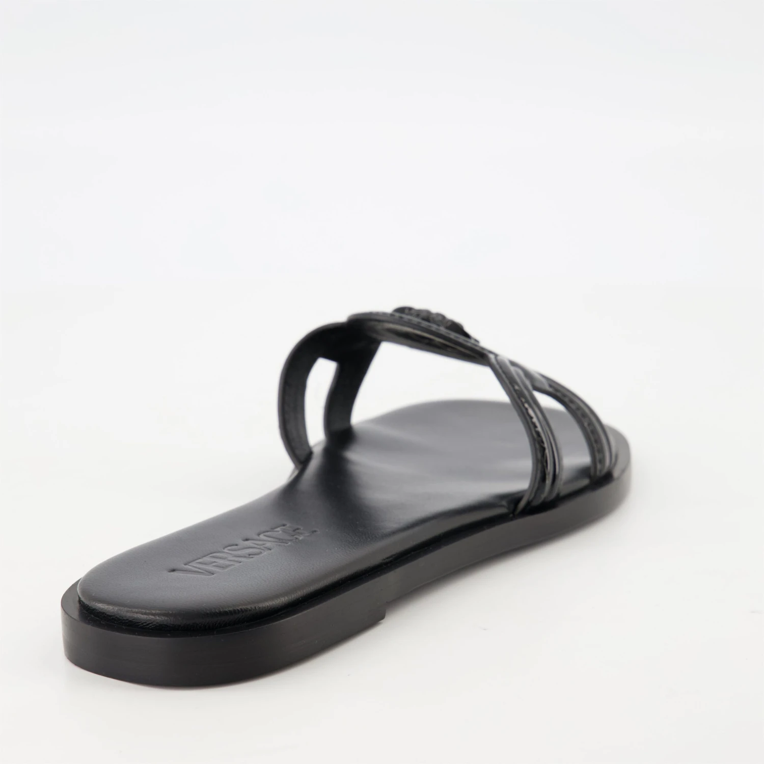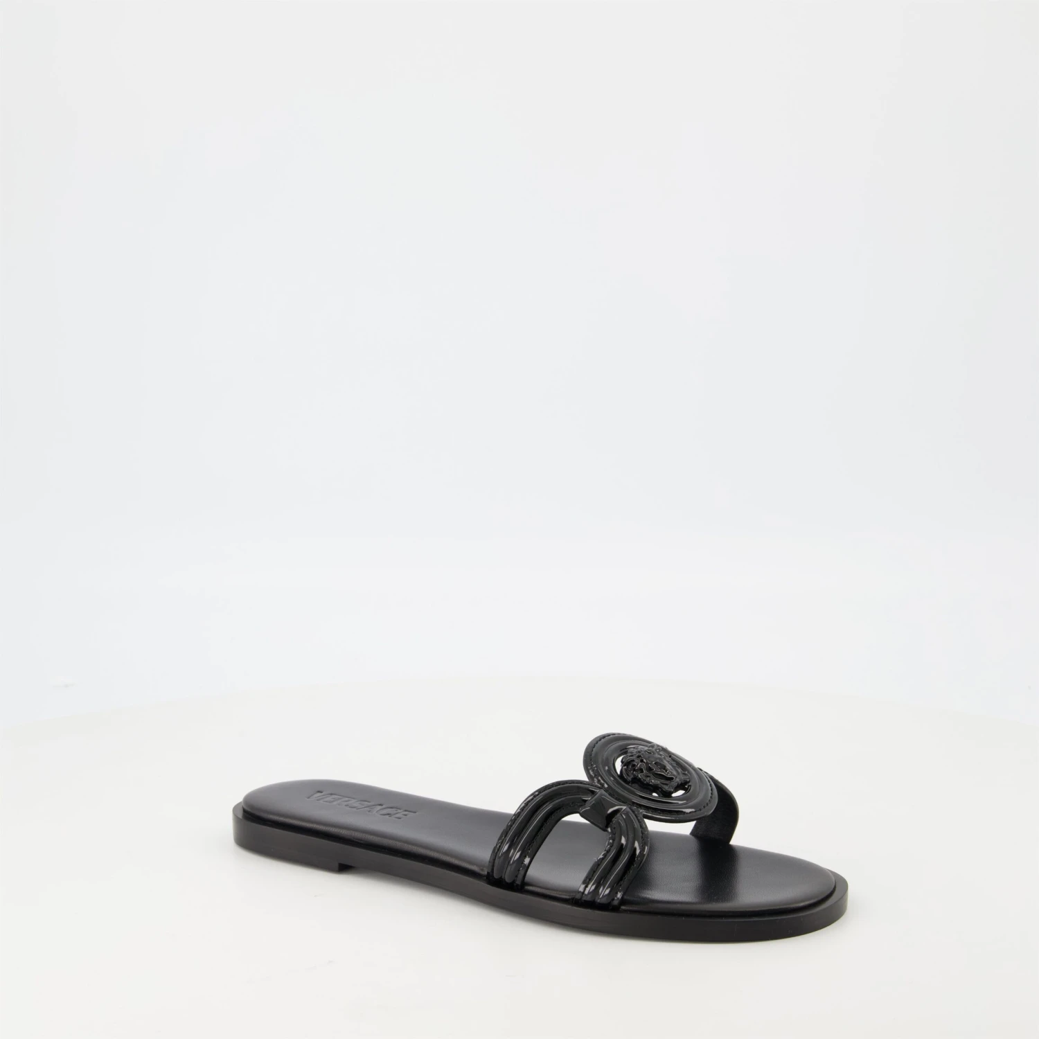Claquettes en cuir noir Medusa ’95 de Versace pour femme de la collection Printemps-Été 2025. Elles présentent un design à enfiler avec un motif emblématique et une semelle en cuir.
