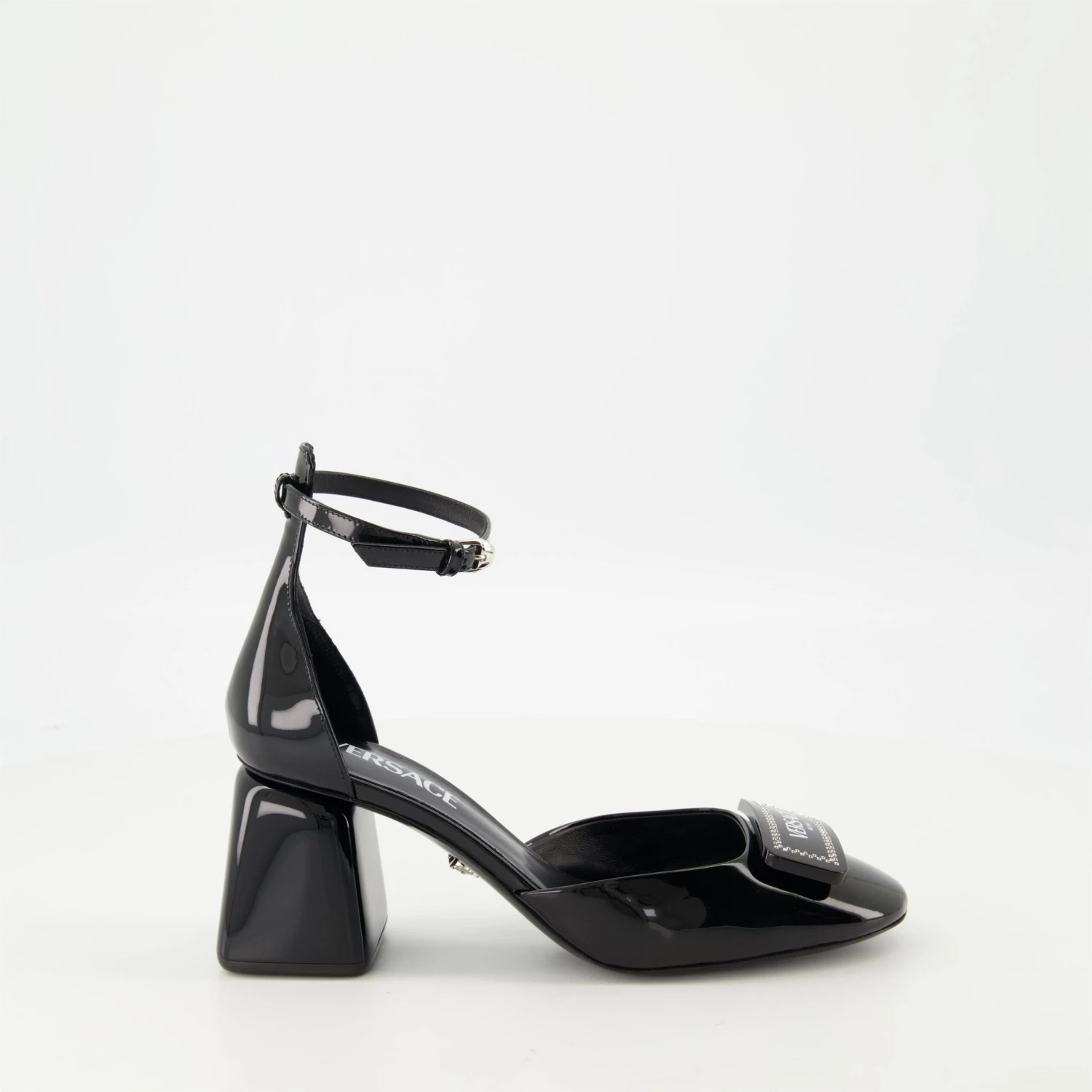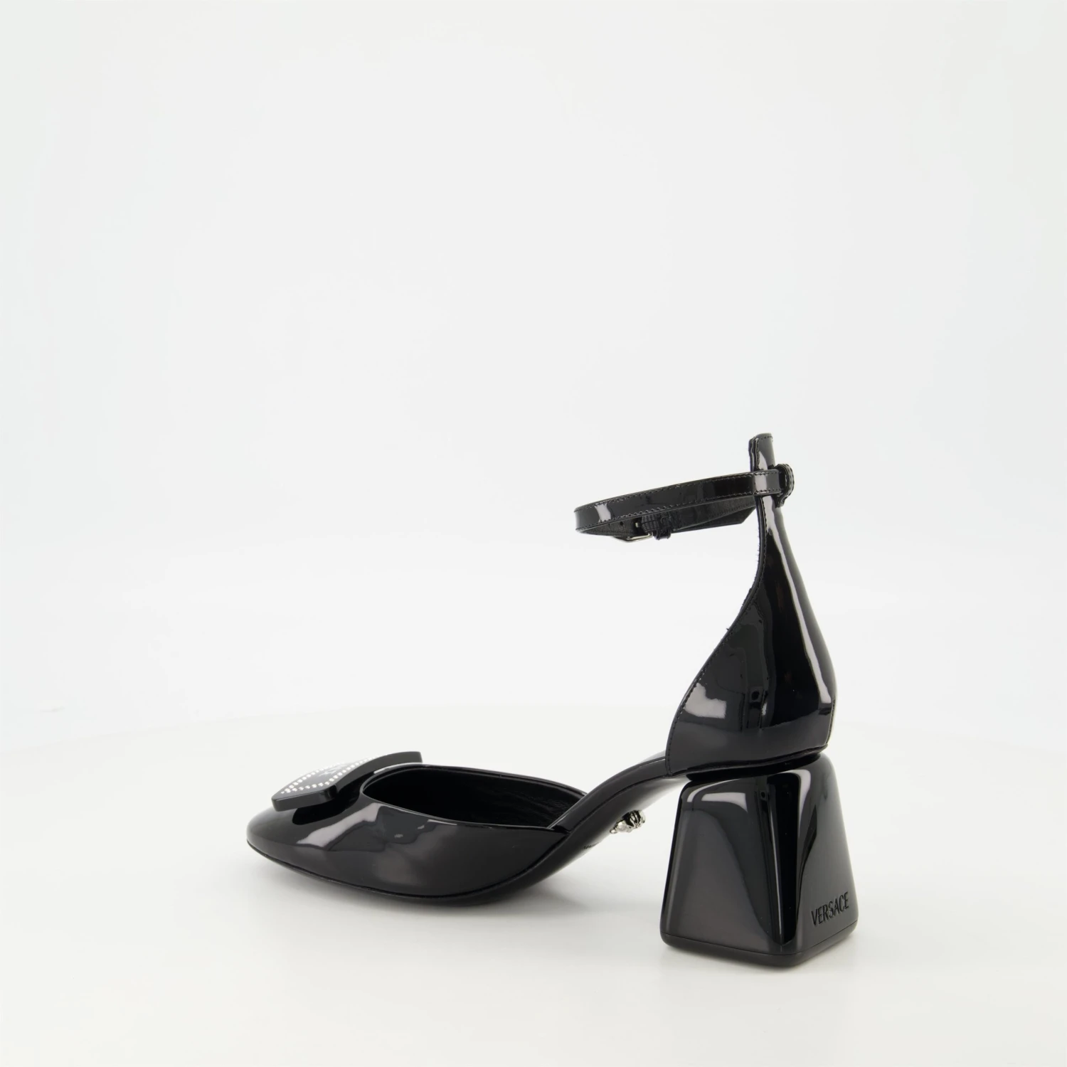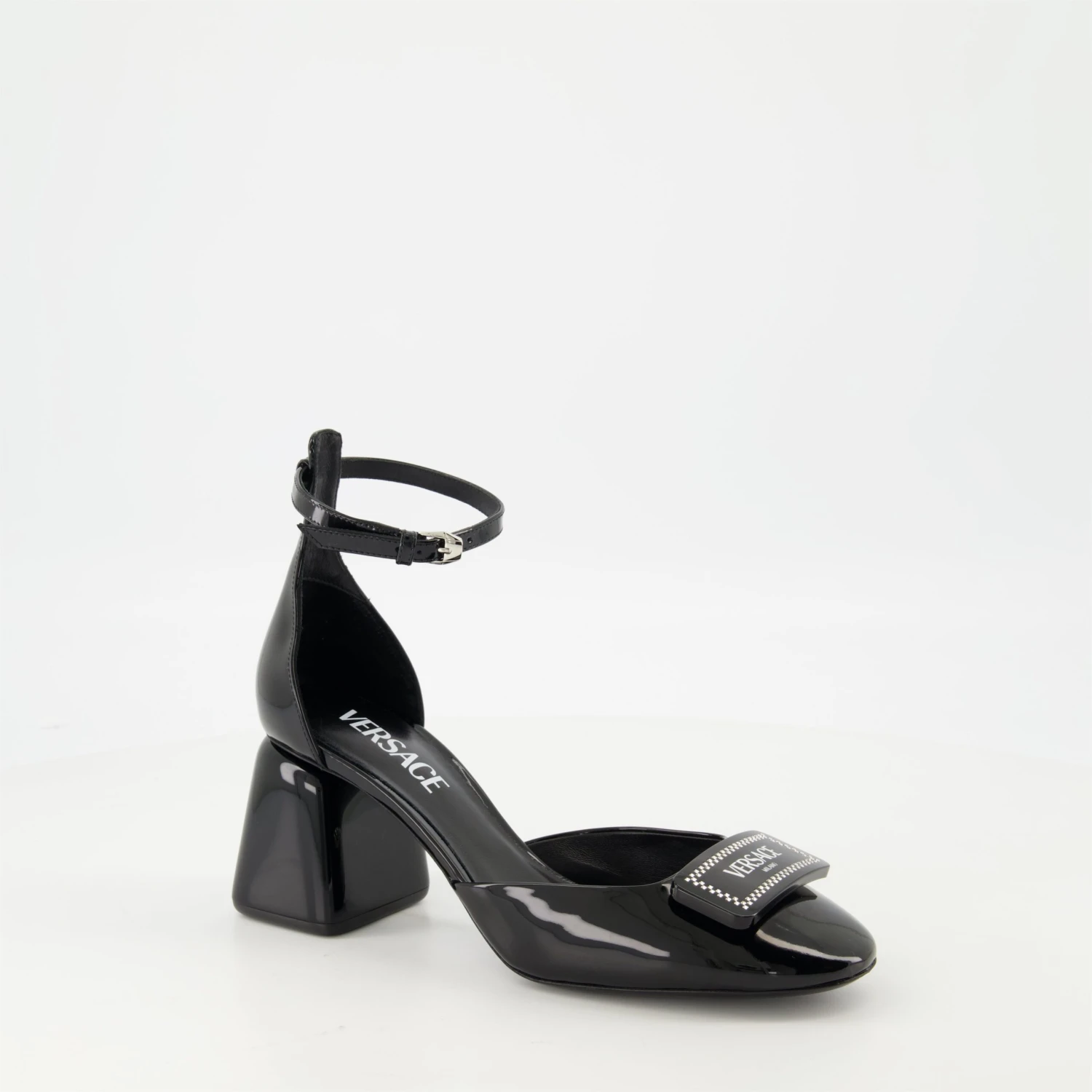 Escarpins en cuir verni noir de la marque Versace pour femme. Cette paire fait partie de la collection Printemps-Été 2025 et présente une bride ajustable à la cheville et des finitions argentées.