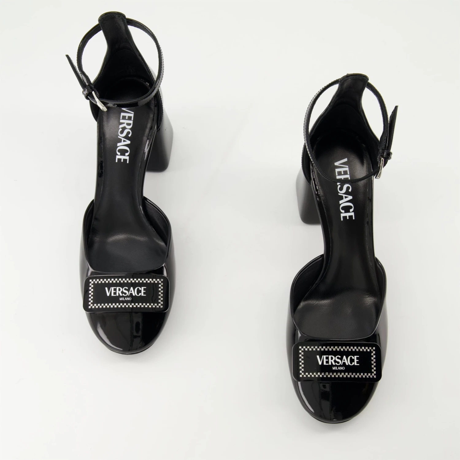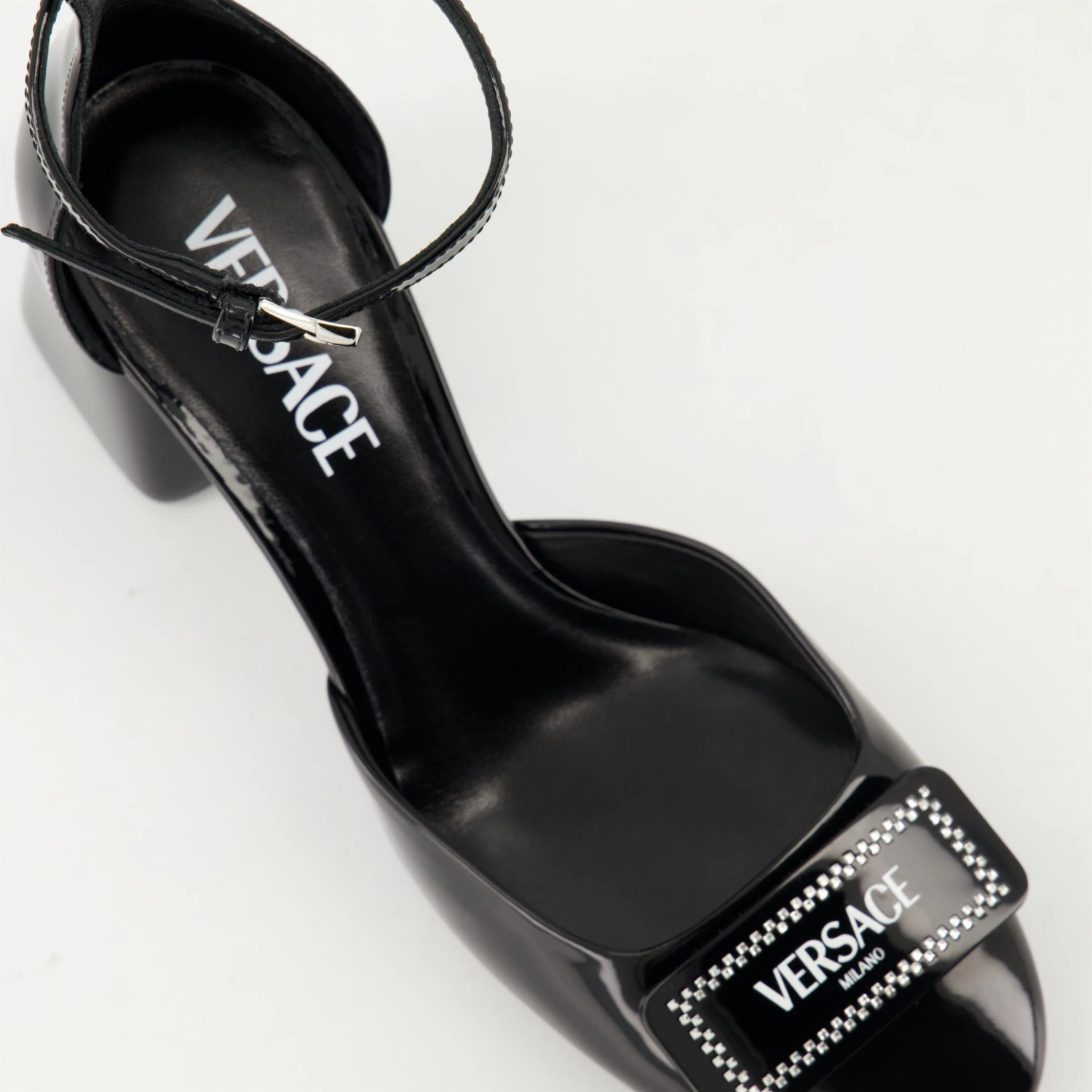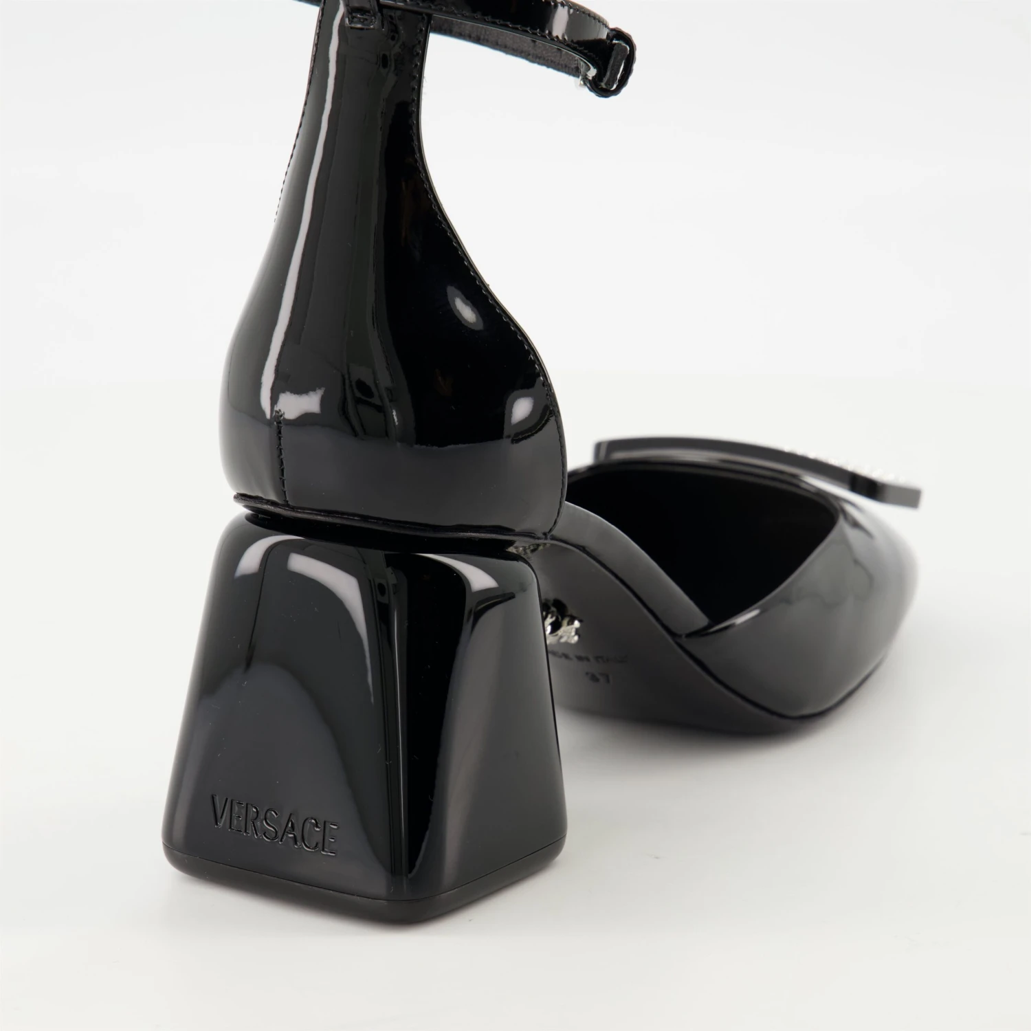 Escarpins en cuir verni noir de la marque Versace pour femme. Cette paire fait partie de la collection Printemps-Été 2025 et présente une bride ajustable à la cheville et des finitions argentées.