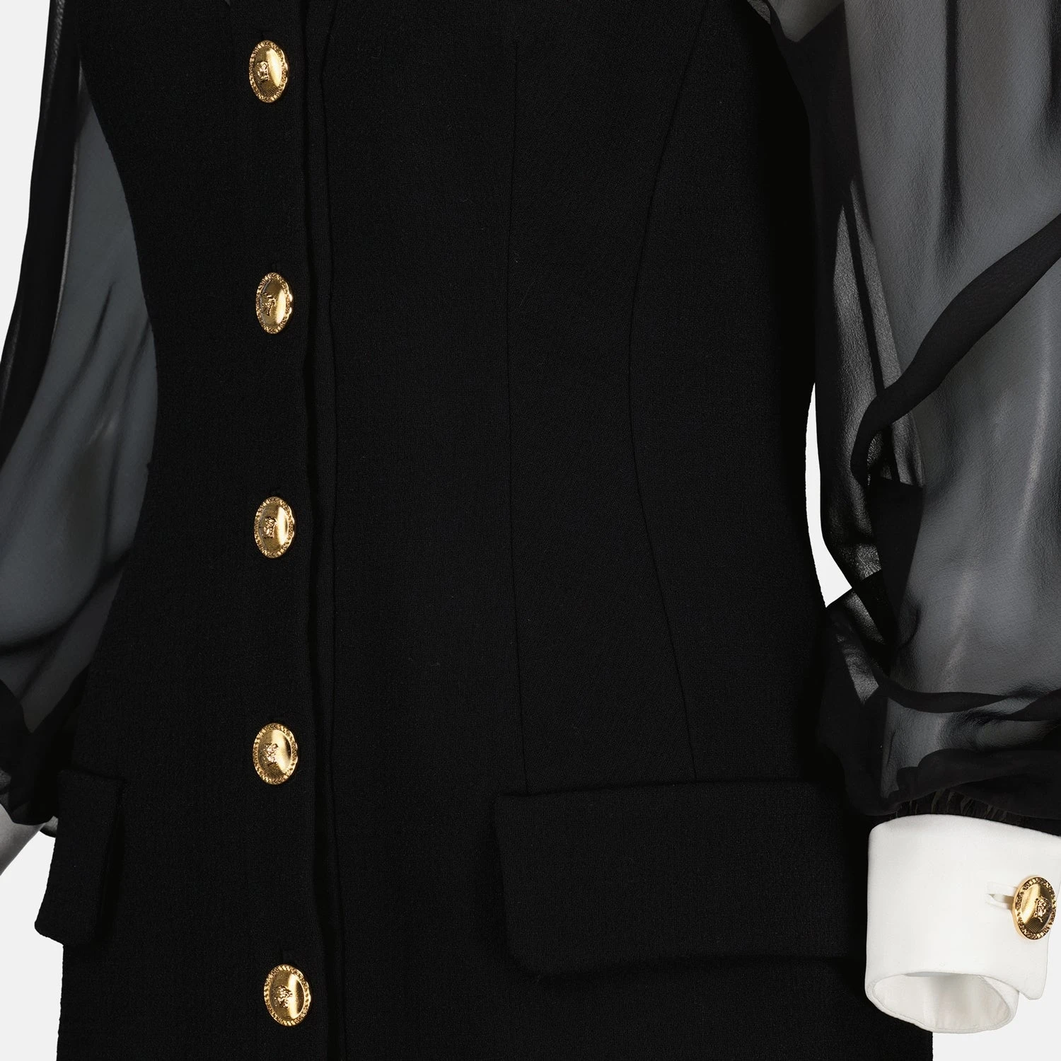 Mini robe noire bustier Versace collection Automne-Hiver 2024 pour Femme. Réalisé en laine et soie. Article Couleur noir. Col pointu et Manches longues.