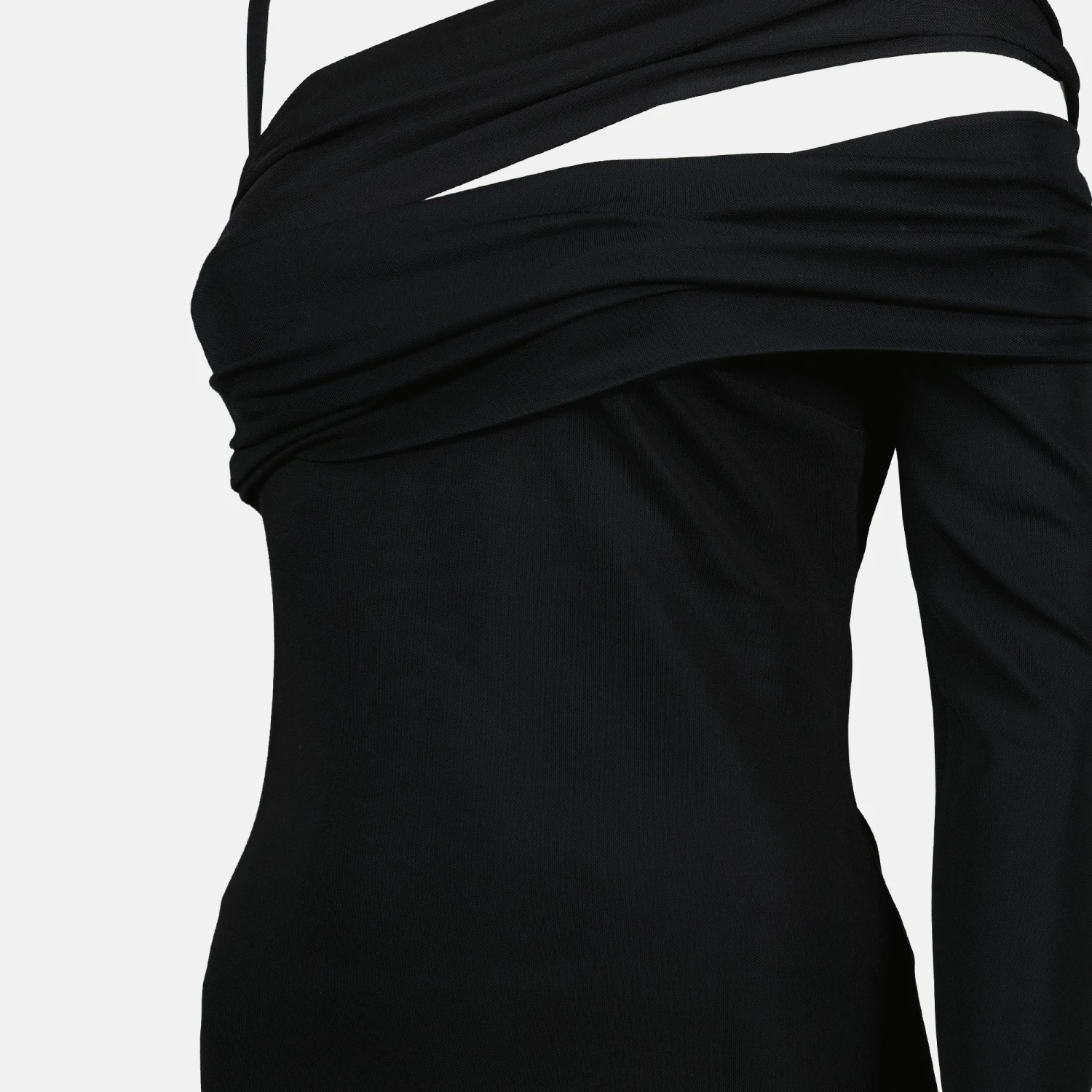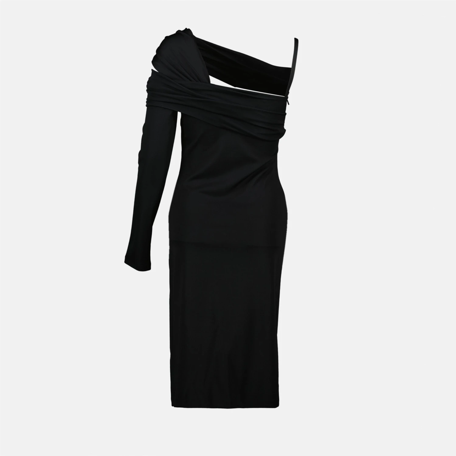 Robe de soirée asymétrique noire de Versace pour femme, réalisée en viscose et nylon. Cette pièce fait partie de la collection Printemps-Été 2025, avec un design asymétrique et un décolleté unique.