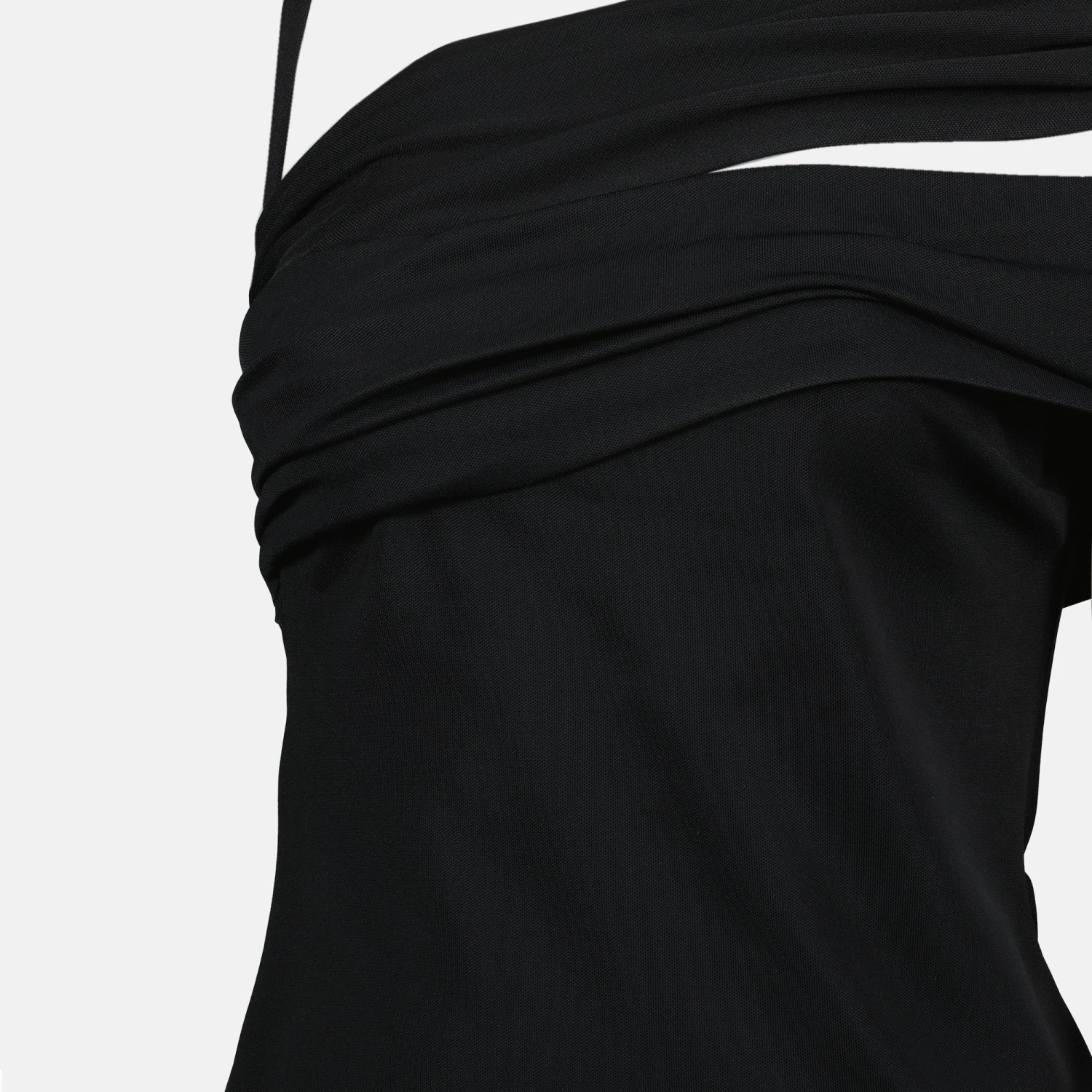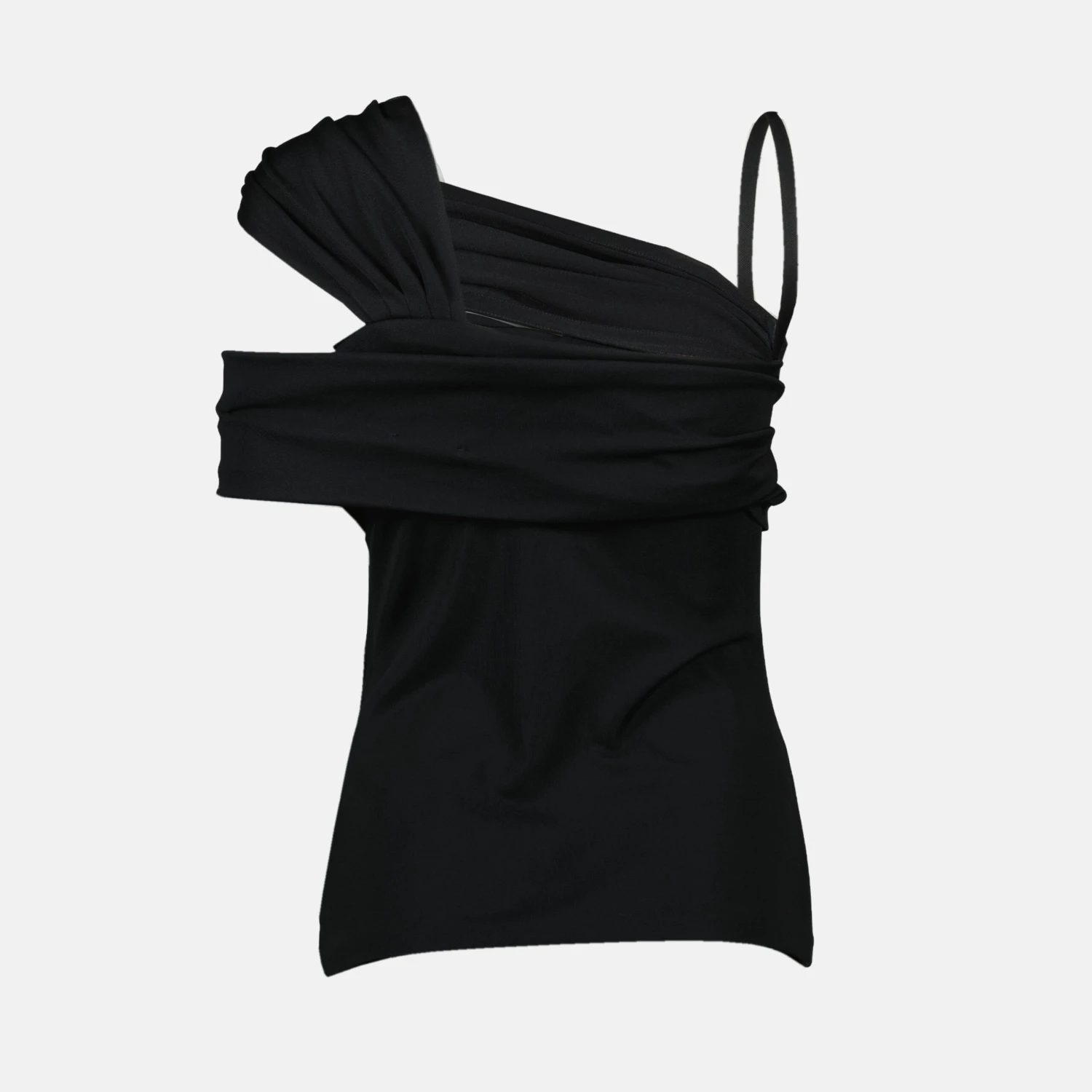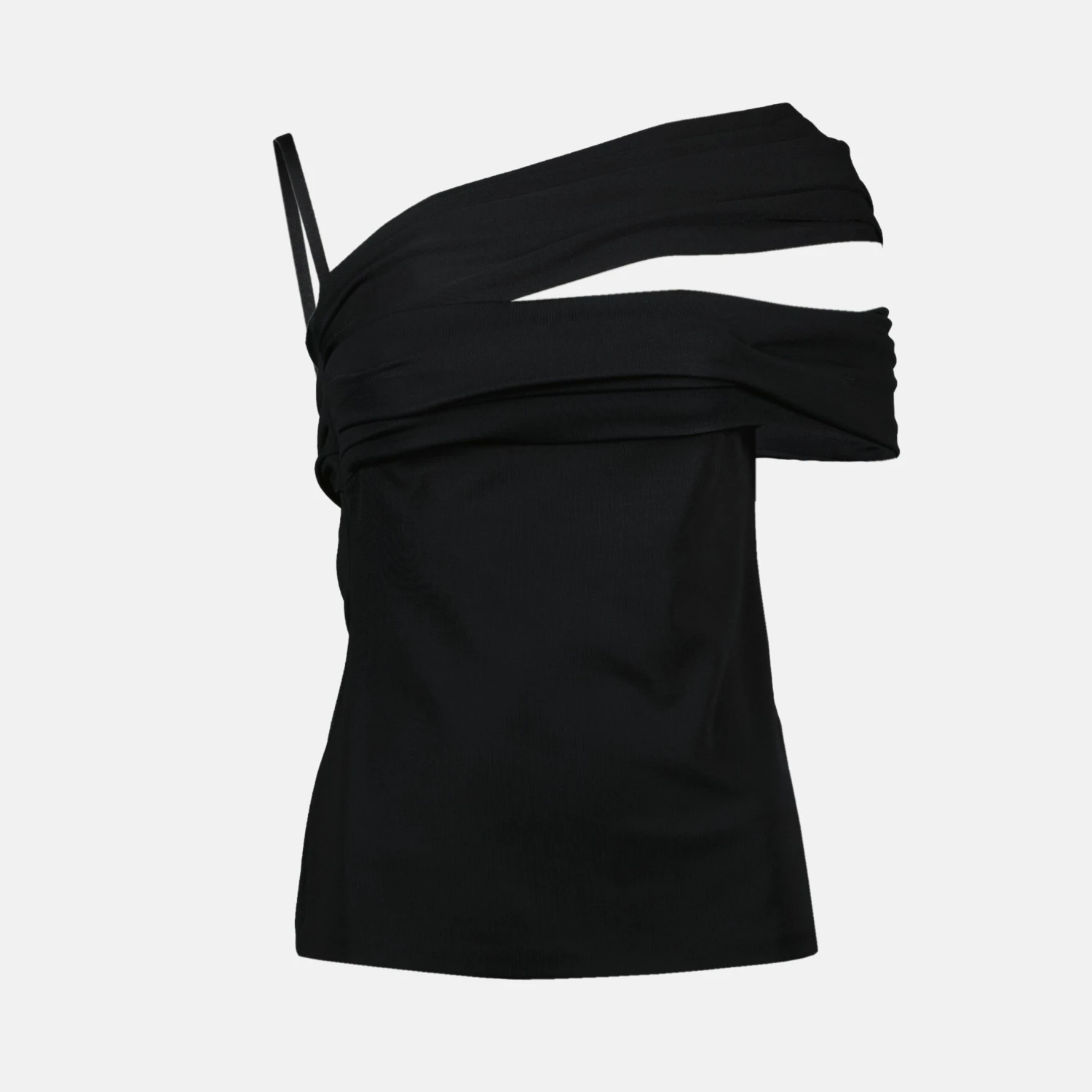 Top stretch asymétrique noire de Versace pour femme, issu de la collection Printemps-Été 2025. Ce haut présente un décolleté asymétrique et une coupe près du corps en viscose et nylon.