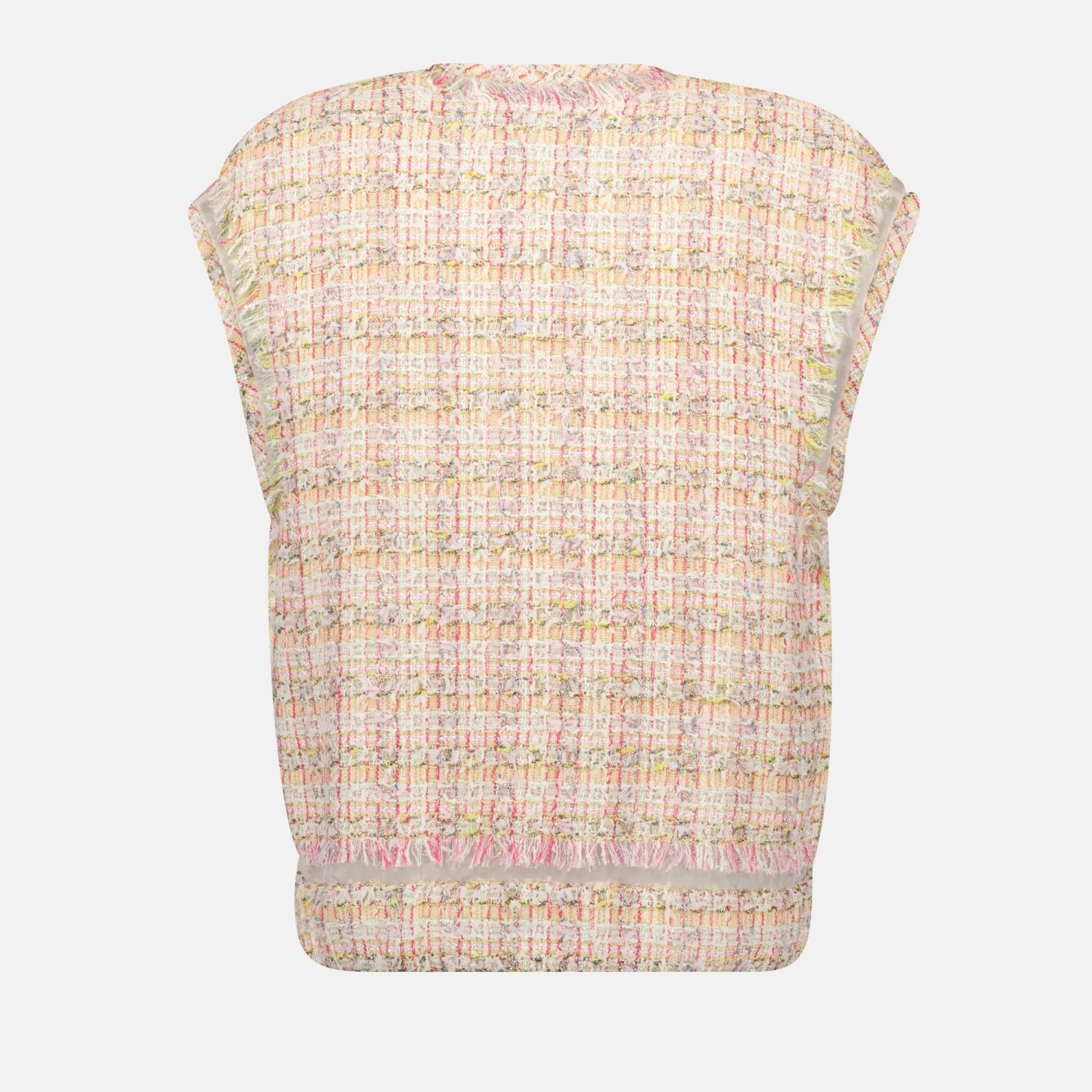 Veste sans manches en tweed de Versace pour femme, réalisée en viscose et polyester. Cette pièce fait partie de la collection Printemps-Été 2025 et se décline en rose avec des détails élégants.