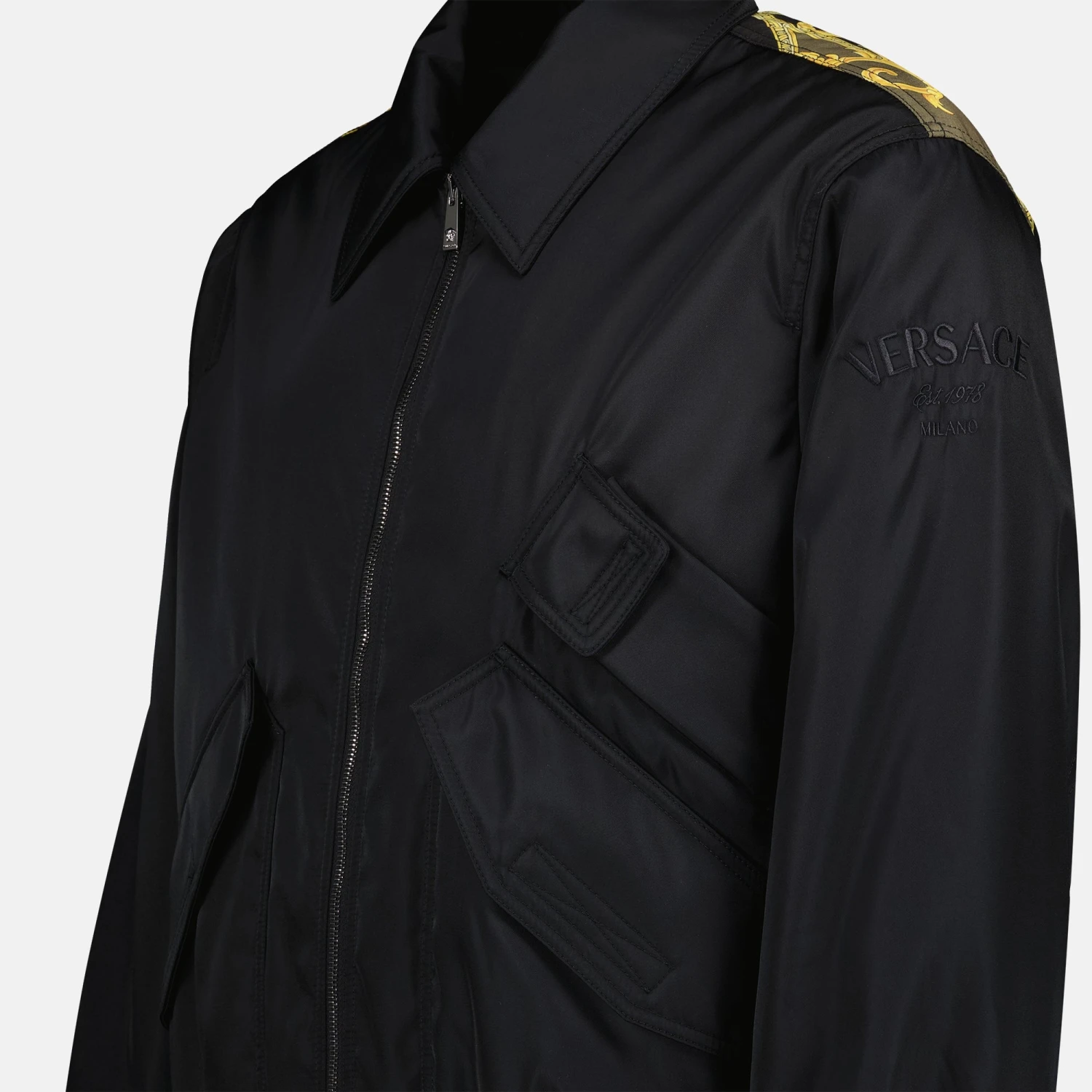 Veste réversible Versace collection Automne-Hiver 2024 pour Homme. Réalisé en nylon. Article Design réversible. Col classique et Manches longues.