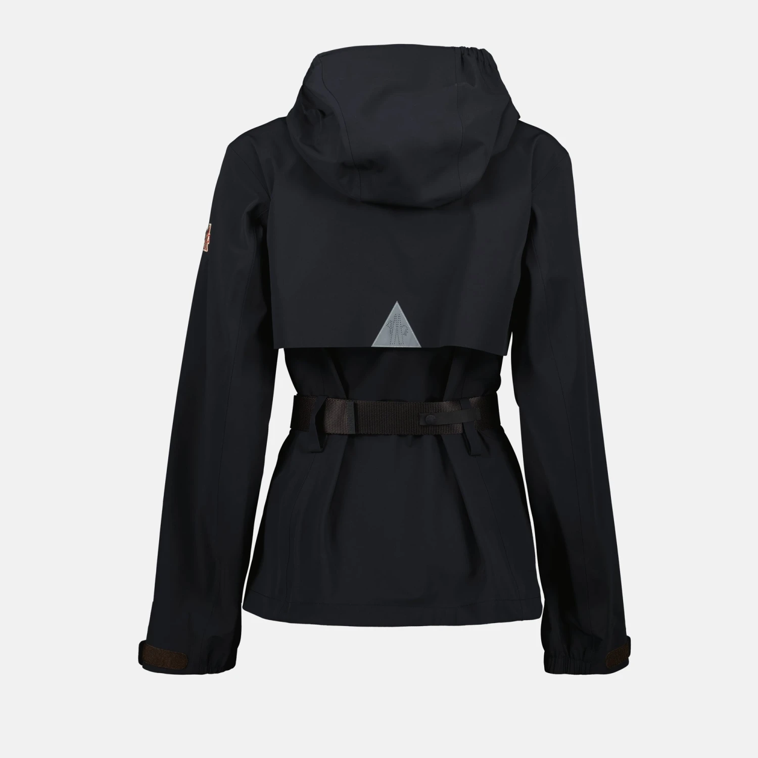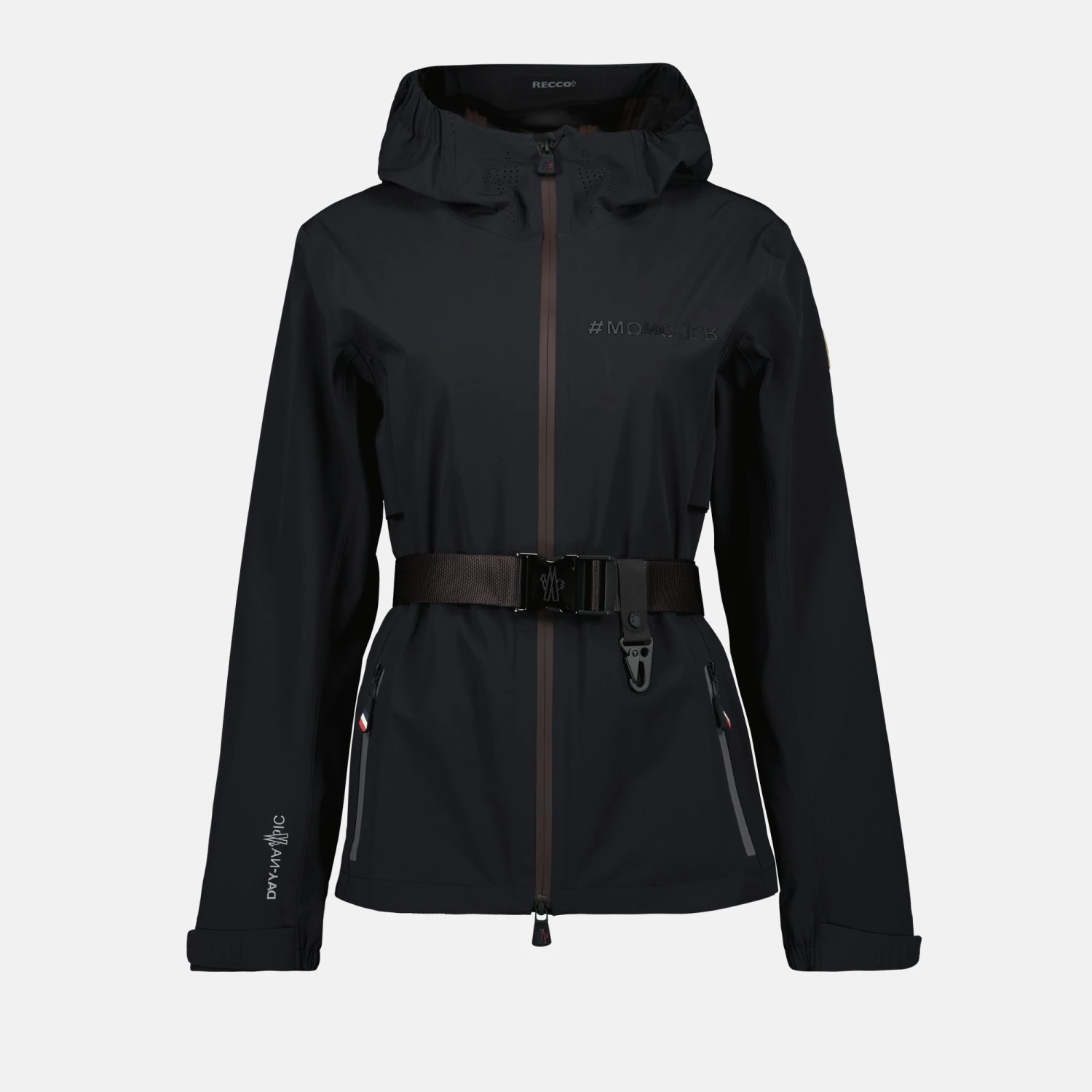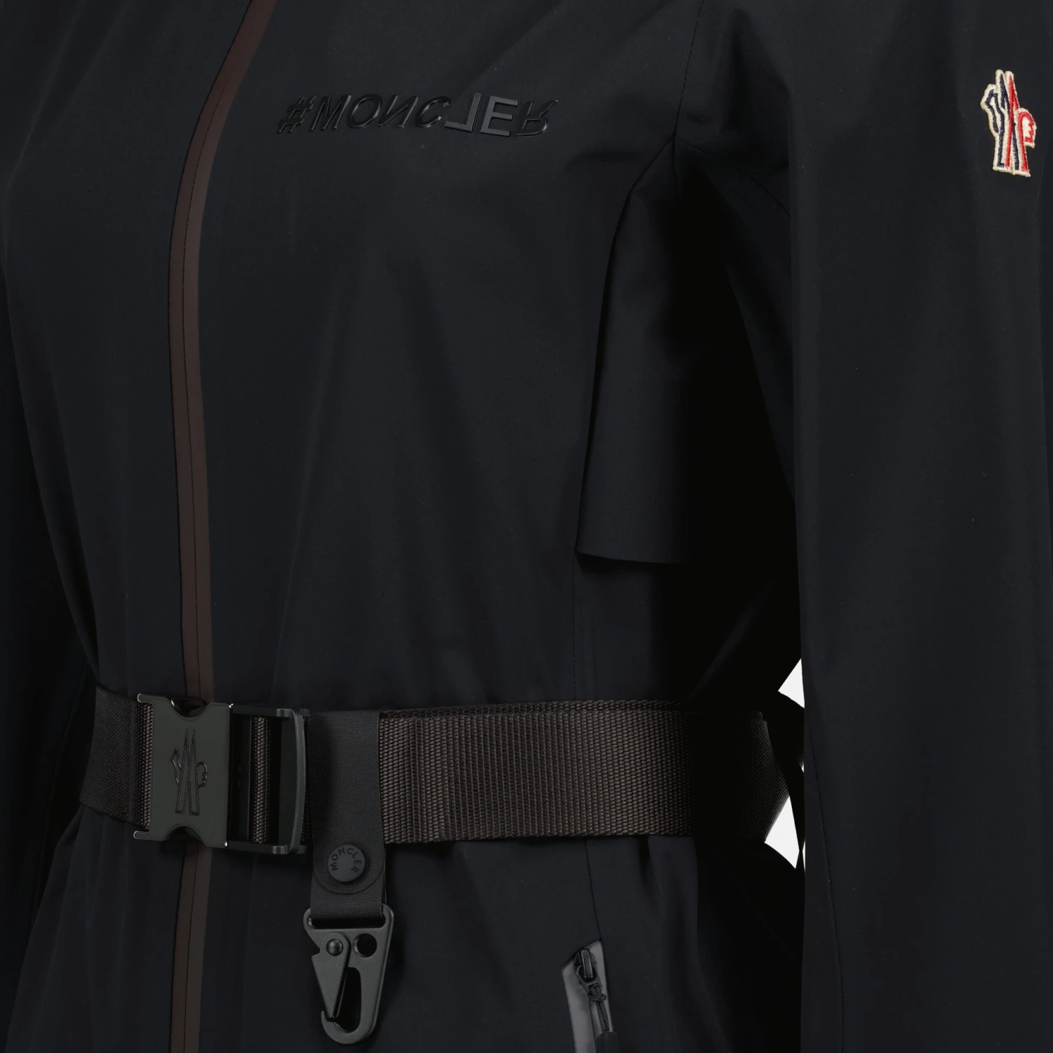 Veste imperméable Fex noir de Moncler Grenoble pour femme, idéale pour l’automne-hiver 2024. Conçue en polyamide et élasthanne, elle allie style et fonctionnalité avec de nombreux détails pratiques.
